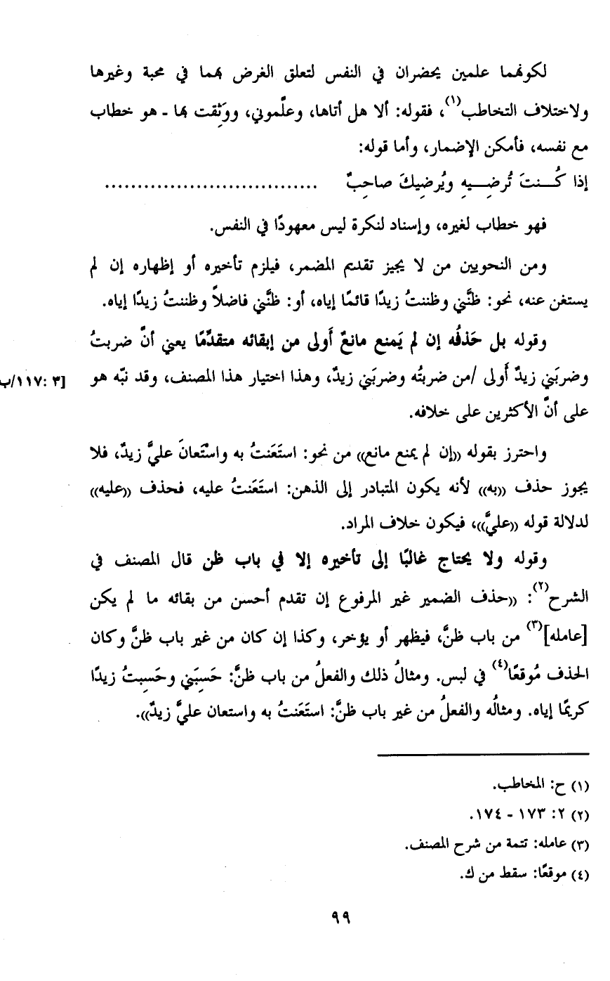 وقوله ولا يحتاج غالبًا إلى تأخيره إلا في باب ظن قال المصنف في الشرح: "حذف الضمير غير المرفوع إن تقدم أحسن من بقائه ما لم يكن] عامله [من باب ظن، فيظهر أو يؤخر، وكذا إن كان من غير باب ظن وكان الحذف موقعًا في لبس. ومثال ذلك والفعل من باب ظن: حسبني وحسبت زيدًا كريمًا إياه. ومثاله والفعل من غير باب ظن: استعنت به واستعان علي زيد".