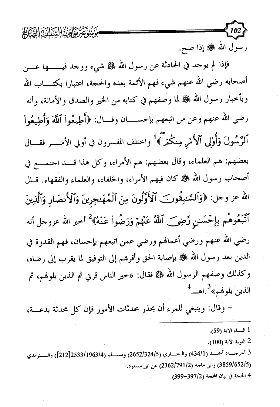 فإذا لم يوجد في الحادثة عن رسول الله - صلى الله عليه وسلم - شيء ووجد فيها عن أصحابه رضي الله عنهم شيء فهم الأئمة بعده والحجة، اعتبارا بكتاب الله وبأخبار رسول الله - صلى الله عليه وسلم - لما وصفهم في كتابه من الخير والصدق والأمانة، وأنه رضي الله عنهم وعن من اتبعهم بإحسان وقال: {أَطِيعُوا اللَّهَ وَأَطِيعُوا الرَّسُولَ وَأُولِي الْأَمْرِ مِنْكُمْ} (¬1) واختلف المفسرون في أولي الأمر فقال بعضهم: هم العلماء، وقال بعضهم: هم الأمراء، وكل هذا قد اجتمع في أصحاب رسول الله - صلى الله عليه وسلم - كان فيهم الأمراء، والخلفاء، والعلماء والفقهاء. قال الله عز وجل: {وَالسَّابِقُونَ الْأَوَّلُونَ مِنَ الْمُهَاجِرِينَ وَالْأَنْصَارِ وَالَّذِينَ اتَّبَعُوهُمْ بِإِحْسَانٍ رَضِيَ اللَّهُ عَنْهُمْ وَرَضُوا عَنْهُ} (¬2) أخبر الله عزوجل أنه رضي الله عنهم ورضي أعمالهم ورضي عمن اتبعهم بإحسان، فهم القدوة في الدين بعد رسول الله - صلى الله عليه وسلم - بإصابة الحق وأقربهم إلى التوفيق لما يقرب إلى رضاه، وكذلك وصفهم الرسول الله - صلى الله عليه وسلم - فقال: «خير الناس قرني ثم الذين يلونهم، ثم الذين يلونهم» (¬3).اهـ (¬4)