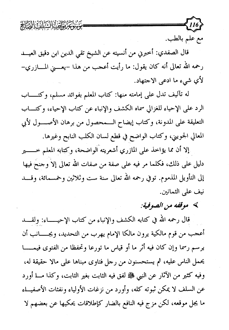 قال الصفدي: أخبرني من أنسيته عن الشيخ تقي الدين ابن دقيق العيد رحمه الله تعالى أنه كان يقول: ما رأيت أعجب من هذا -يعني المازري- لأي شيء ما ادعى الاجتهاد.