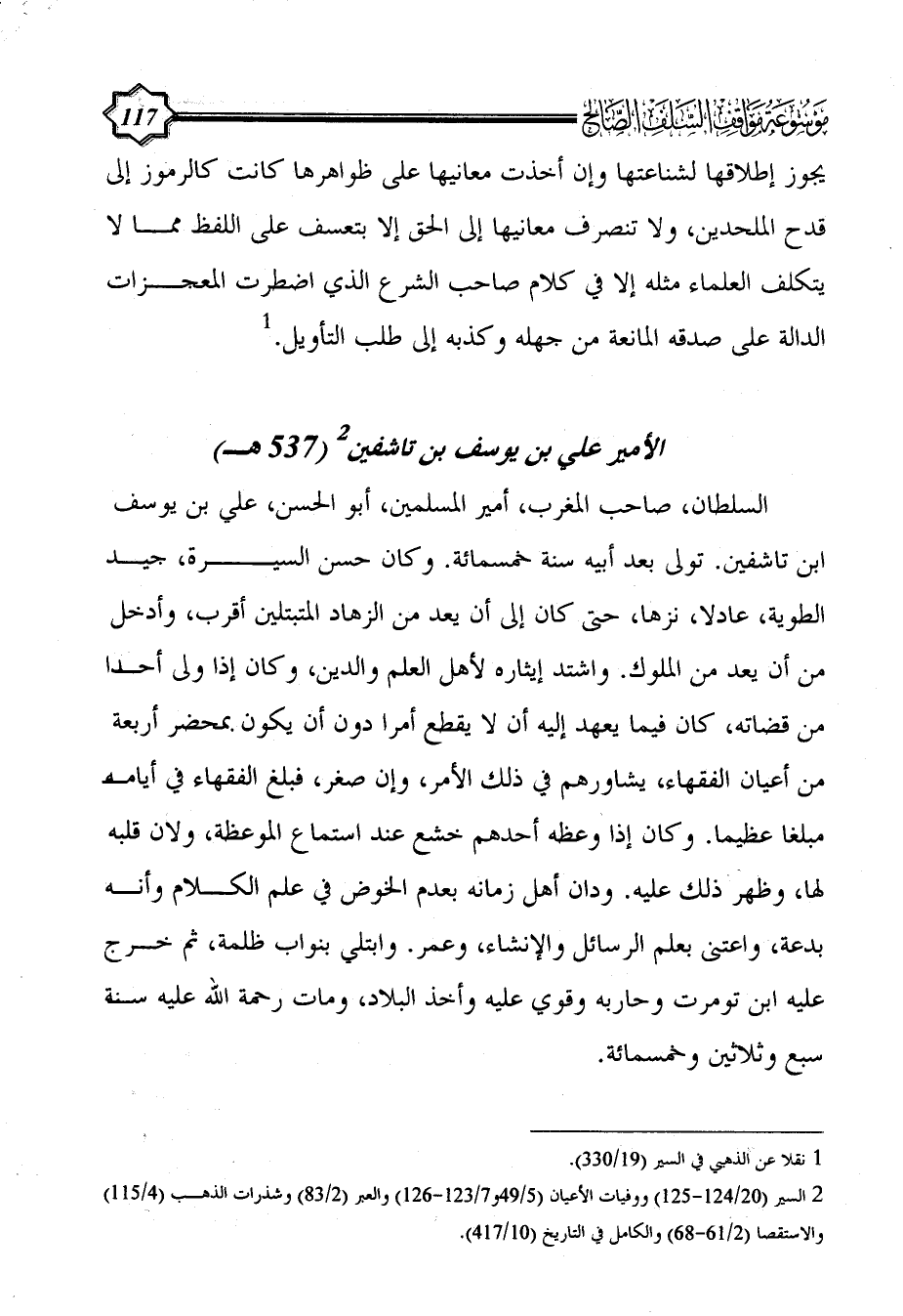 السلطان، صاحب المغرب، أمير المسلمين، أبو الحسن، علي بن يوسف ابن تاشفين. تولى بعد أبيه سنة خمسمائة. وكان حسن السيرة، جيد الطوية، عادلا، نزها، حتى كان إلى أن يعد من الزهاد المتبتلين أقرب، وأدخل من أن يعد من الملوك. واشتد إيثاره لأهل العلم والدين، وكان إذا ولى أحدا من قضاته، كان فيما يعهد إليه أن لا يقطع أمرا دون أن يكون بمحضر أربعة من أعيان الفقهاء، يشاورهم في ذلك الأمر، وإن صغر، فبلغ الفقهاء في أيامه مبلغا عظيما. وكان إذا وعظه أحدهم خشع عند استماع الموعظة، ولان قلبه لها، وظهر ذلك عليه. ودان أهل زمانه بعدم الخوض في علم الكلام وأنه بدعة، واعتنى بعلم الرسائل والإنشاء، وعمر. وابتلي بنواب ظلمة، ثم خرج عليه ابن تومرت وحاربه وقوي عليه وأخذ البلاد، ومات رحمة الله عليه سنة سبع وثلاثين وخمسمائة.