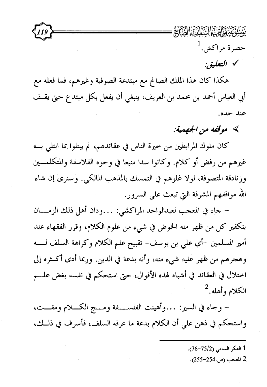 - جاء في المعجب لعبد الواحد المراكشي: ... ودان أهل ذلك الزمان بتكفير كل من ظهر منه الخوض في شيء من علوم الكلام، وقرر الفقهاء عند أمير المسلمين -أي علي بن يوسف- تقبيح علم الكلام وكراهة السلف له وهجرهم من ظهر عليه شيء منه، وأنه بدعة في الدين. وربما أدى أكثره إلى اختلال في العقائد في أشباه لهذه الأقوال، حتى استحكم في نفسه بغض علم الكلام وأهله. (¬2)