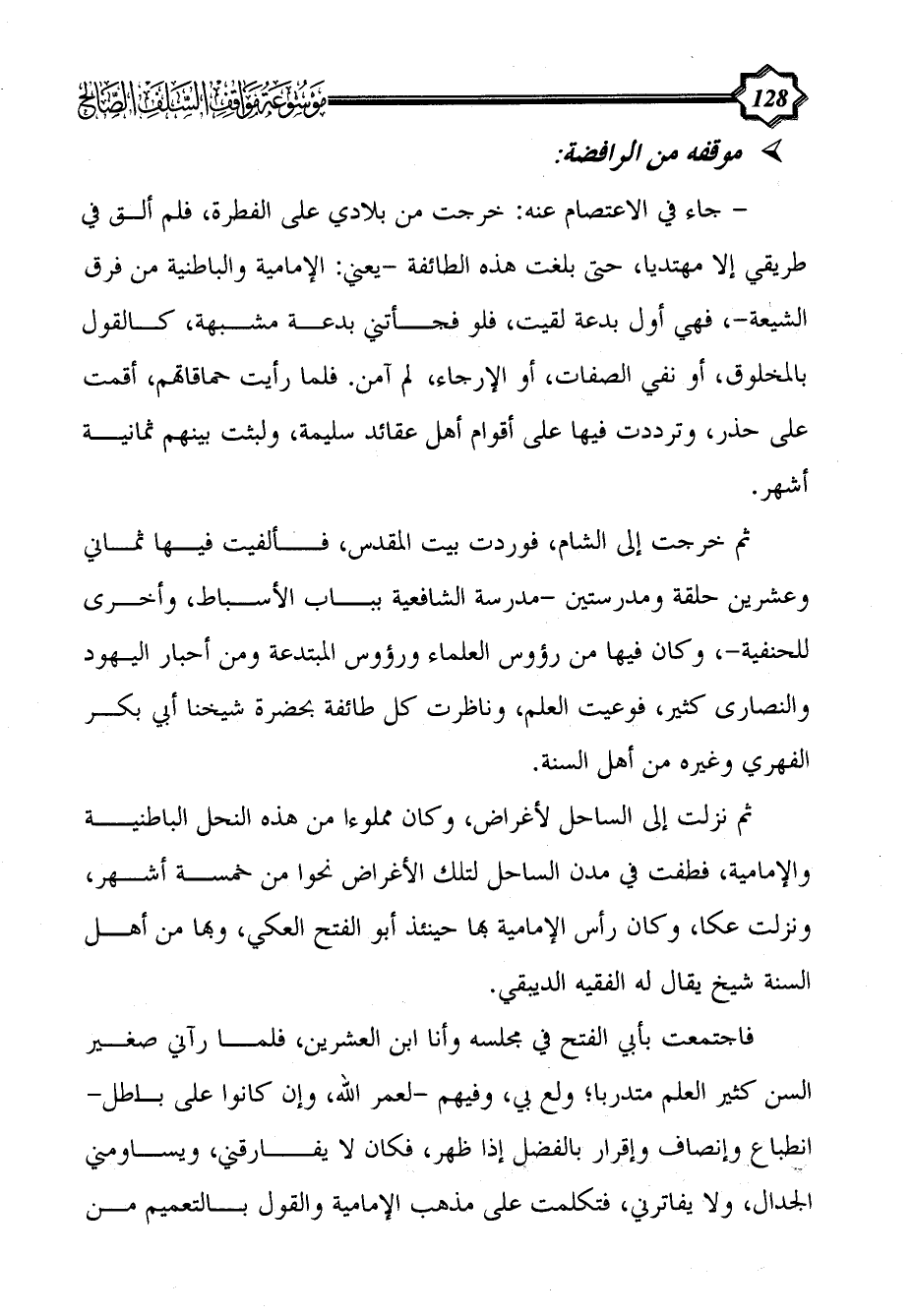 ثم نزلت إلى الساحل لأغراض، وكان مملوءا من هذه النحل الباطنية والإمامية، فطفت في مدن الساحل لتلك الأغراض نحوا من خمسة أشهر، ونزلت عكا، وكان رأس الإمامية بها حينئذ أبو الفتح العكي، وبها من أهل السنة شيخ يقال له الفقيه الديبقي.