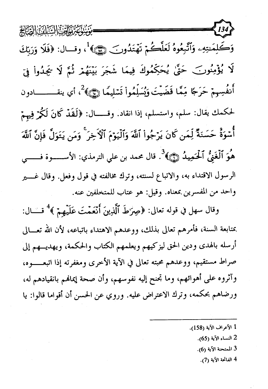 وَكَلِمَاتِهِ وَاتَّبِعُوهُ لَعَلَّكُمْ تَهْتَدُونَ (158)} (¬1)، وقال: {فَلَا وَرَبِّكَ لَا يُؤْمِنُونَ حَتَّى يُحَكِّمُوكَ فِيمَا شَجَرَ بَيْنَهُمْ ثُمَّ لَا يَجِدُوا فِي أَنْفُسِهِمْ حَرَجًا مِمَّا قَضَيْتَ وَيُسَلِّمُوا تَسْلِيمًا (65)} (¬2)، أي ينقادون لحكمك يقال: سلم، واستسلم، إذا انقاد. وقال: {لَقَدْ كَانَ لَكُمْ فِيهِمْ أُسْوَةٌ حَسَنَةٌ لِمَنْ كَانَ يَرْجُو اللَّهَ وَالْيَوْمَ الْآَخِرَ وَمَنْ يَتَوَلَّ فَإِنَّ اللَّهَ هُوَ الْغَنِيُّ الْحَمِيدُ (6)} (¬3). قال محمد بن علي الترمذي: الأسوة في الرسول الاقتداء به، والاتباع لسنته، وترك مخالفته في قول وفعل. وقال غير واحد من المفسرين بمعناه. وقيل: هو عتاب للمتخلفين عنه.