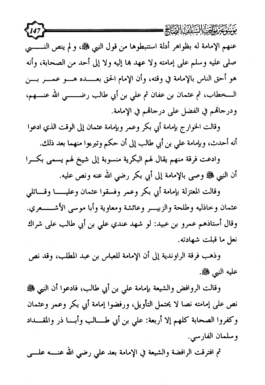 عنهم الإمامة له بظواهر أدلة استنبطوها من قول النبي - صلى الله عليه وسلم -، ولم ينص النبي صلى عليه وسلم على إمامته ولا عهد بها إليه ولا إلى أحد من الصحابة، وأنه هو أحق الناس بالإمامة في وقته، وأن الإمام الحق بعده هو عمر بن الخطاب، ثم عثمان بن عفان ثم علي بن أبي طالب رضي الله عنهم، ودرجاتهم في الفضل على درجاتهم في الإمامة.