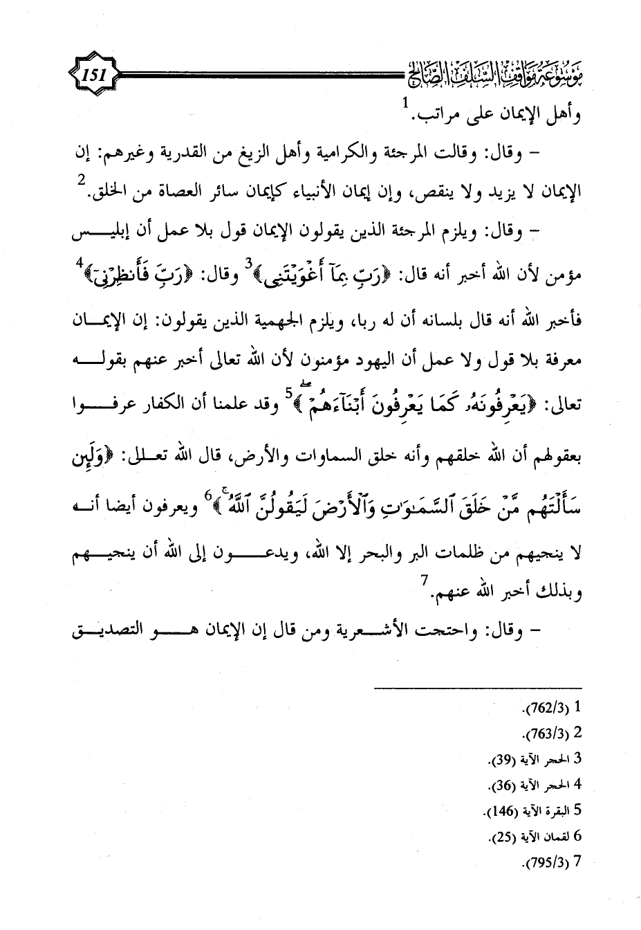 - وقال: واحتجت الأشعرية ومن قال إن الإيمان هو التصديق