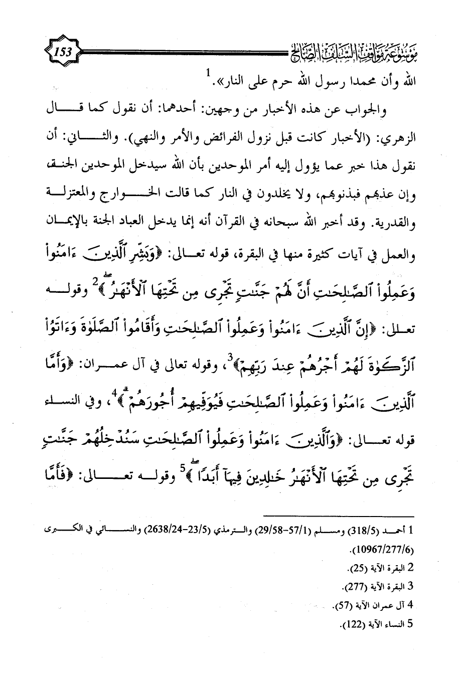 والجواب عن هذه الأخبار من وجهين: أحدهما: أن نقول كما قال الزهري: (الأخبار كانت قبل نزول الفرائض والأمر والنهي). والثاني: أن نقول هذا خبر عما يؤول إليه أمر الموحدين بأن الله سيدخل الموحدين الجنة، وإن عذبهم فبذنوبهم، ولا يخلدون في النار كما قالت الخوارج والمعتزلة والقدرية. وقد أخبر الله سبحانه في القرآن أنه إنما يدخل العباد الجنة بالإيمان والعمل في آيات كثيرة منها في البقرة، قوله تعالى: {وَبَشِّرِ الَّذِينَ آَمَنُوا وَعَمِلُوا الصَّالِحَاتِ أَنَّ لَهُمْ جَنَّاتٍ تَجْرِي مِنْ تَحْتِهَا الْأَنْهَارُ} (¬2) وقوله تعالى: {إِنَّ الَّذِينَ آَمَنُوا وَعَمِلُوا الصَّالِحَاتِ وَأَقَامُوا الصَّلَاةَ وَآَتَوُا الزَّكَاةَ لَهُمْ أَجْرُهُمْ عِنْدَ رَبِّهِمْ} (¬3)، وقوله تعالى في آل عمران: {وَأَمَّا الَّذِينَ آَمَنُوا وَعَمِلُوا الصَّالِحَاتِ فَيُوَفِّيهِمْ أُجُورَهُمْ} (¬4)، وفي النساء قوله تعالى: {وَالَّذِينَ آَمَنُوا وَعَمِلُوا الصَّالِحَاتِ سَنُدْخِلُهُمْ جَنَّاتٍ تَجْرِي مِنْ تَحْتِهَا الْأَنْهَارُ خَالِدِينَ فِيهَا أَبَدًا} (¬5) وقوله تعالى: {فَأَمَّا
