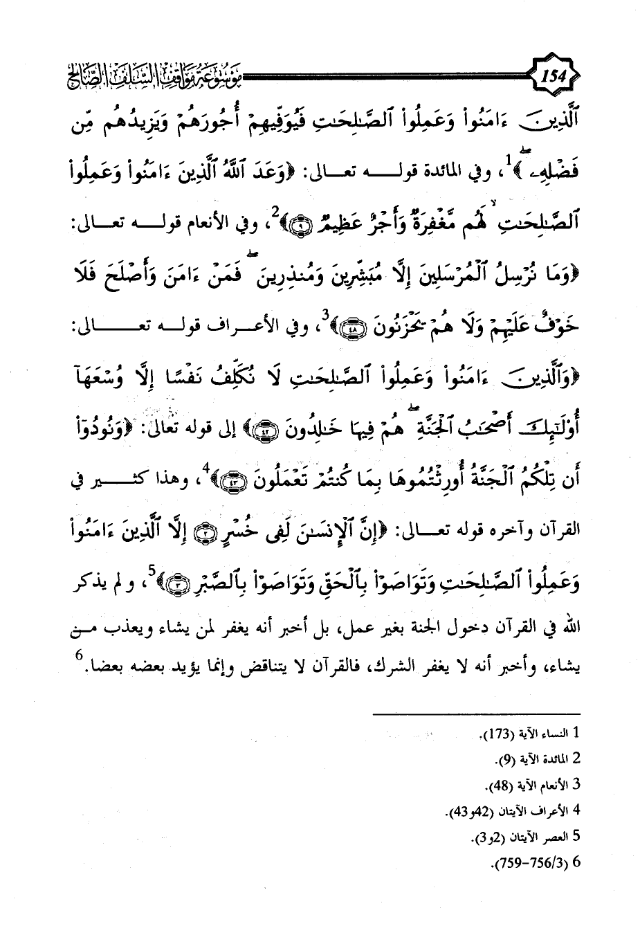 وفي الأعراف قوله تعالى: {وَالَّذِينَ آَمَنُوا وَعَمِلُوا الصَّالِحَاتِ لَا نُكَلِّفُ نَفْسًا إِلَّا وُسْعَهَا أُولَئِكَ أَصْحَابُ الْجَنَّةِ هُمْ فِيهَا خَالِدُونَ (42)} إلى قوله تعالى: {وَنُودُوا أَنْ تِلْكُمُ الْجَنَّةُ أُورِثْتُمُوهَا بِمَا كُنْتُمْ تَعْمَلُونَ (43)} (¬4)، وهذا كثير في القرآن وآخره قوله تعالى: {إِنَّ الْإِنْسَانَ لَفِي خُسْرٍ (2) إِلَّا الَّذِينَ آَمَنُوا وَعَمِلُوا الصَّالِحَاتِ وَتَوَاصَوْا بِالْحَقِّ وَتَوَاصَوْا بِالصَّبْرِ (3)} (¬5)، ولم يذكر الله في القرآن دخول الجنة بغير عمل، بل أخبر أنه يغفر لمن يشاء ويعذب من يشاء، وأخبر أنه لا يغفر الشرك، فالقرآن لا يتناقض وإنما يؤيد بعضه بعضا. (¬6)