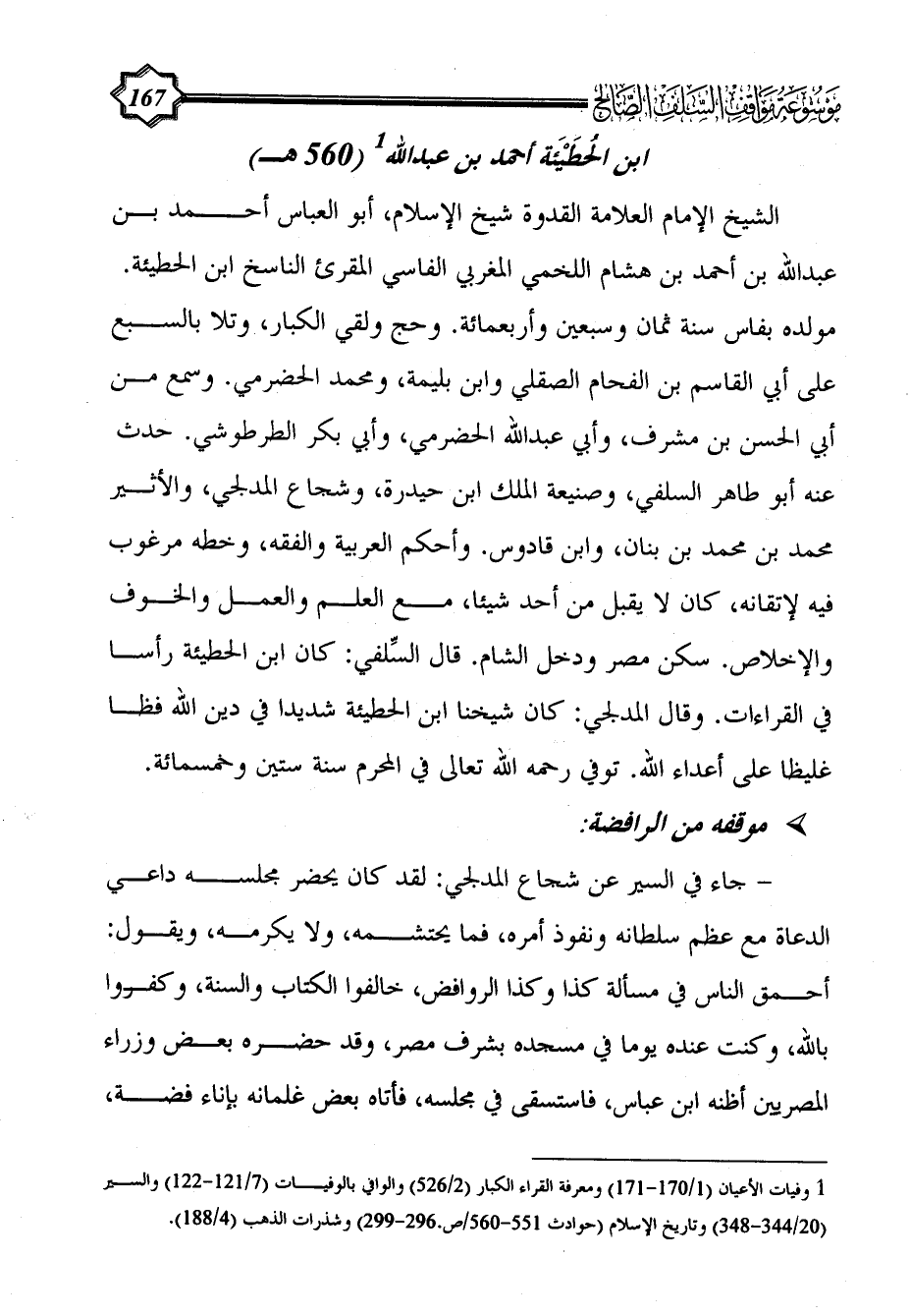 (¬1) وفيات الأعيان (1/ 170 - 171) ومعرفة القراء الكبار (2/ 526) والوافي بالوفيات (7/ 121 - 122) والسير (20/ 344 - 348) وتاريخ الإسلام (حوادث 551 - 560/ص.296 - 299) وشذرات الذهب (4/ 188).