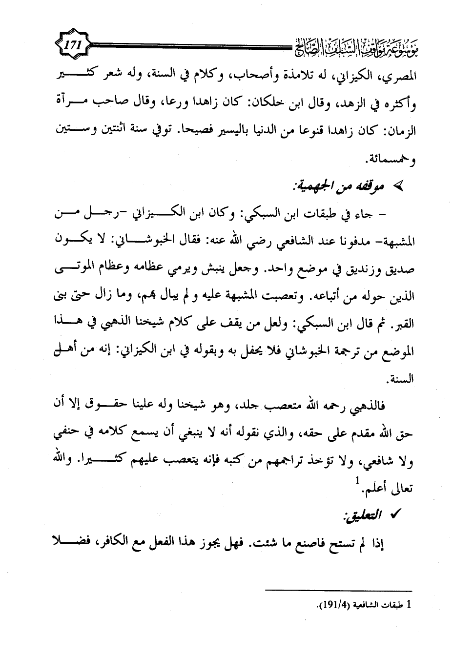 - جاء في طبقات ابن السبكي: وكان ابن الكيزاني -رجل من المشبهة- مدفونا عند الشافعي رضي الله عنه: فقال الخبوشاني: لا يكون صديق وزنديق في موضع واحد. وجعل ينبش ويرمي عظامه وعظام الموتى الذين حوله من أتباعه. وتعصبت المشبهة عليه ولم يبال بهم، وما زال حتى بنى القبر. ثم قال ابن السبكي: ولعل من يقف على كلام شيخنا الذهبي في هذا الموضع من ترجمة الخبوشاني فلا يحفل به وبقوله في ابن الكيزاني: إنه من أهل السنة.