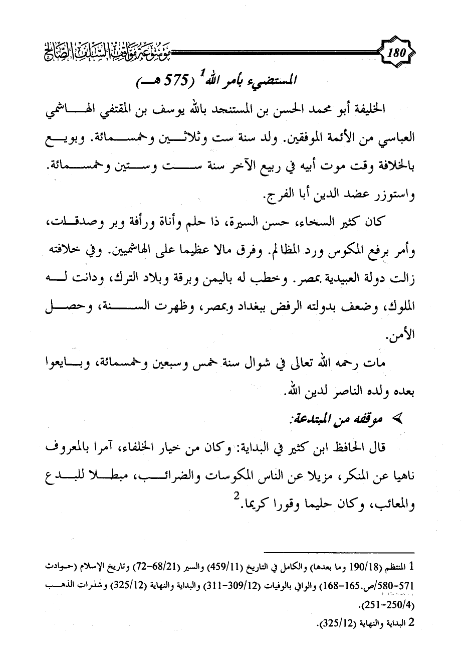 الخليفة أبو محمد الحسن بن المستنجد بالله يوسف بن المقتفي الهاشمي العباسي من الأئمة الموفقين. ولد سنة ست وثلاثين وخمسمائة. وبويع بالخلافة وقت موت أبيه في ربيع الآخر سنة ست وستين وخمسمائة. واستوزر عضد الدين أبا الفرج.