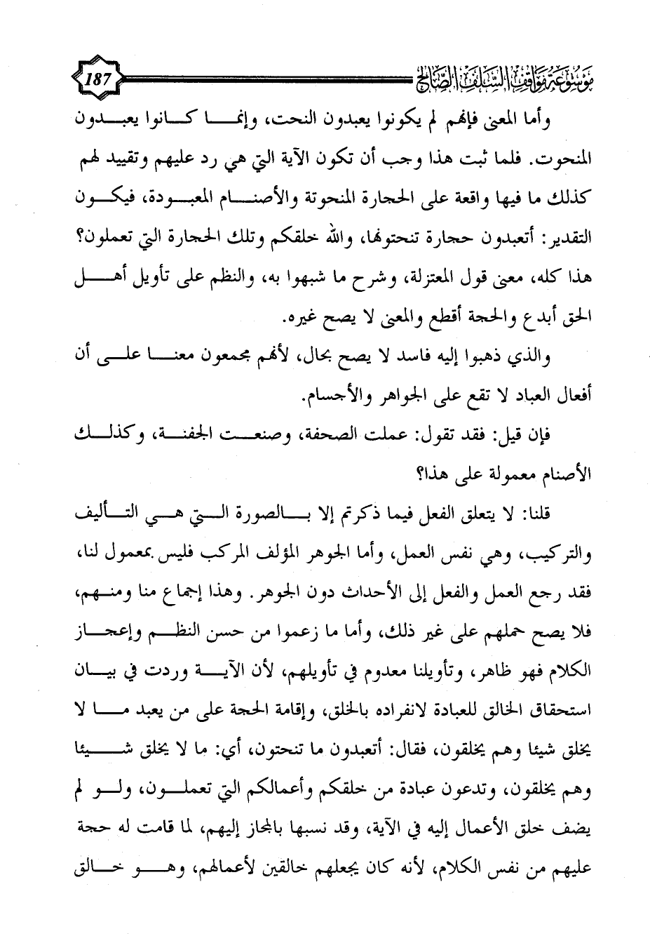 قلنا: لا يتعلق الفعل فيما ذكرتم إلا بالصورة التي هي التأليف والتركيب، وهي نفس العمل، وأما الجوهر المؤلف المركب فليس بمعمول لنا، فقد رجع العمل والفعل إلى الأحداث دون الجوهر. وهذا إجماع منا ومنهم، فلا يصح حملهم على غير ذلك، وأما ما زعموا من حسن النظم وإعجاز الكلام فهو ظاهر، وتأويلنا معدوم في تأويلهم، لأن الآية وردت في بيان استحقاق الخالق للعبادة لانفراده بالخلق، وإقامة الحجة على من يعبد ما لا يخلق شيئا وهم يخلقون، فقال: أتعبدون ما تنحتون، أي: ما لا يخلق شيئا وهم يخلقون، وتدعون عبادة من خلقكم وأعمالكم التي تعملون، ولو لم يضف خلق الأعمال إليه في الآية، وقد نسبها بالمجاز إليهم، لما قامت له حجة عليهم من نفس الكلام، لأنه كان يجعلهم خالقين لأعمالهم، وهو خالق