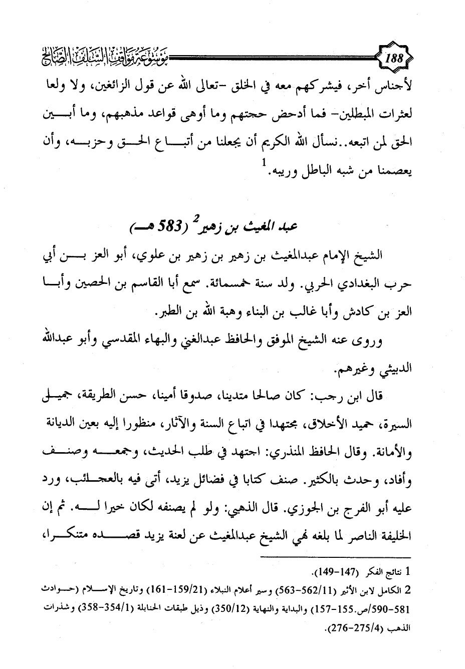 (¬2) الكامل لابن الأثير (11/ 562 - 563) وسير أعلام النبلاء (21/ 159 - 161) وتاريخ الإسلام (حوادث 581 - 590/ص.155 - 157) والبداية والنهاية (12/ 350) وذيل طبقات الحنابلة (1/ 354 - 358) وشذرات الذهب (4/ 275 - 276).