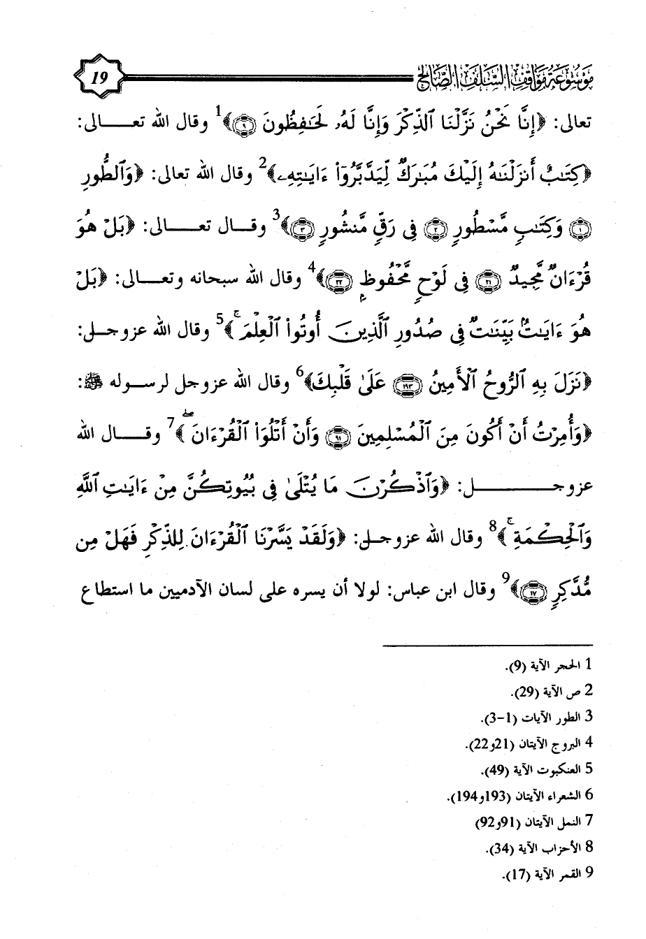 تعالى: {إِنَّا نَحْنُ نَزَّلْنَا الذِّكْرَ وَإِنَّا لَهُ لَحَافِظُونَ (9)} (¬1) وقال الله تعالى: {كِتَابٌ أَنْزَلْنَاهُ إِلَيْكَ مُبَارَكٌ لِيَدَّبَّرُوا آَيَاتِهِ} (¬2) وقال الله تعالى: {وَالطُّورِ (1) وَكِتَابٍ مَسْطُورٍ (2) فِي رَقٍّ مَنْشُورٍ (3)} (¬3) وقال تعالى: {بَلْ هُوَ قُرْآَنٌ مَجِيدٌ (21) فِي لَوْحٍ مَحْفُوظٍ (22)} (¬4) وقال الله سبحانه وتعالى: {بَلْ هُوَ آَيَاتٌ بَيِّنَاتٌ فِي صُدُورِ الَّذِينَ أُوتُوا الْعِلْمَ} (¬5) وقال الله عزوجل: {نَزَلَ بِهِ الرُّوحُ الْأَمِينُ (193) عَلَى قَلْبِكَ} (¬6) وقال الله عزوجل لرسوله - صلى الله عليه وسلم -: {وَأُمِرْتُ أَنْ أَكُونَ مِنَ الْمُسْلِمِينَ (91) وَأَنْ أَتْلُوَ الْقُرْآَنَ} (¬7) وقال الله عزوجل: {وَاذْكُرْنَ مَا يُتْلَى فِي بُيُوتِكُنَّ مِنْ آَيَاتِ اللَّهِ وَالْحِكْمَةِ} (¬8) وقال الله عزوجل: {وَلَقَدْ يَسَّرْنَا الْقُرْآَنَ لِلذِّكْرِ فَهَلْ مِنْ مُدَّكِرٍ (17)} (¬9) وقال ابن عباس: لولا أن يسره على لسان الآدميين ما استطاع