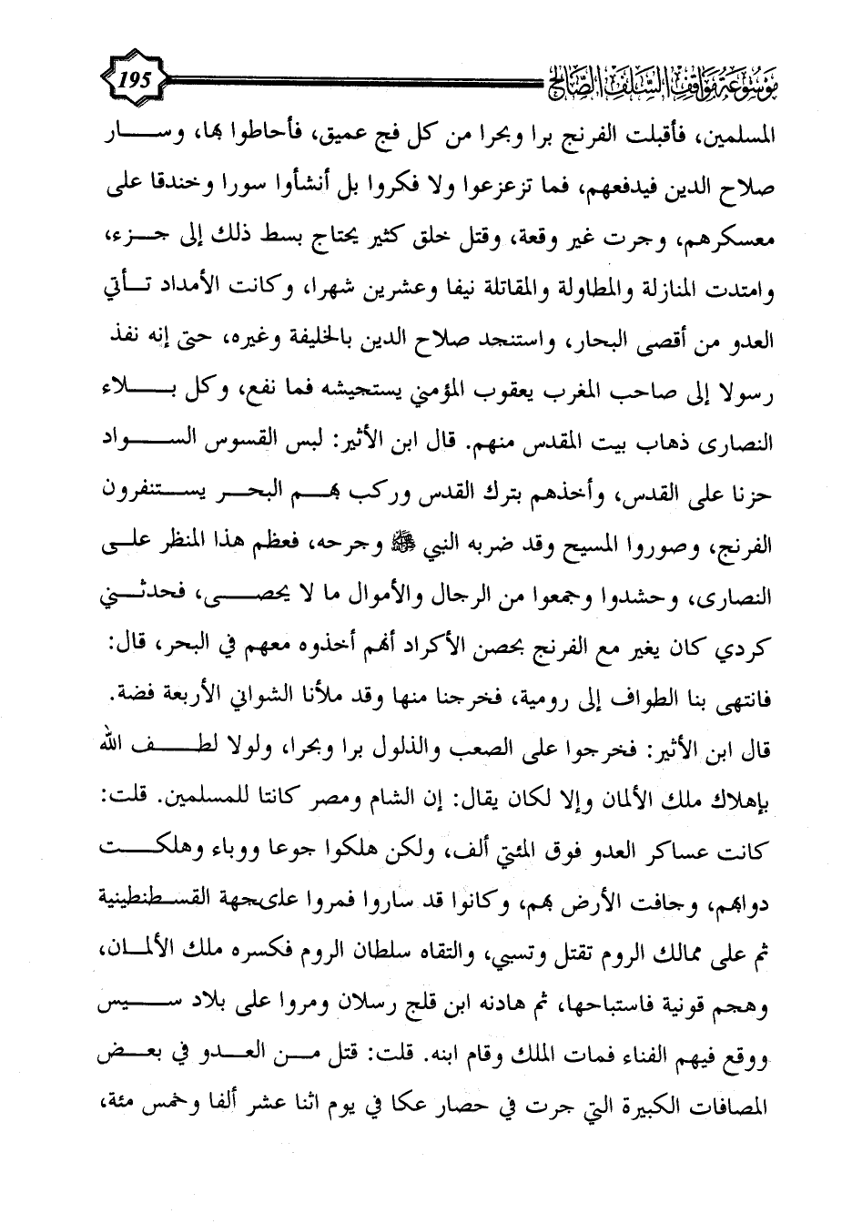 المسلمين، فأقبلت الفرنج برا وبحرا من كل فج عميق، فأحاطوا بها، وسار صلاح الدين فيدفعهم، فما تزعزعوا ولا فكروا بل أنشأوا سورا وخندقا على معسكرهم، وجرت غير وقعة، وقتل خلق كثير يحتاج بسط ذلك إلى جزء، وامتدت المنازلة والمطاولة والمقاتلة نيفا وعشرين شهرا، وكانت الأمداد تأتي العدو من أقصى البحار، واستنجد صلاح الدين بالخليفة وغيره، حتى إنه نفذ رسولا إلى صاحب المغرب يعقوب المؤمني يستجيشه فما نفع، وكل بلاء النصارى ذهاب بيت المقدس منهم. قال ابن الأثير: لبس القسوس السواد حزنا على القدس، وأخذهم بترك القدس وركب بهم البحر يستنفرون الفرنج، وصوروا المسيح وقد ضربه النبي - صلى الله عليه وسلم - وجرحه، فعظم هذا المنظر على النصارى، وحشدوا وجمعوا من الرجال والأموال ما لا يحصى، فحدثني كردي كان يغير مع الفرنج بحصن الأكراد أنهم أخذوه معهم في البحر، قال: فانتهى بنا الطواف إلى رومية، فخرجنا منها وقد ملأنا الشواني الأربعة فضة. قال ابن الأثير: فخرجوا على الصعب والذلول برا وبحرا، ولولا لطف الله بإهلاك ملك الألمان وإلا لكان يقال: إن الشام ومصر كانتا للمسلمين. قلت: كانت عساكر العدو فوق المئتي ألف، ولكن هلكوا جوعا ووباء وهلكت دوابهم، وجافت الأرض بهم، وكانوا قد ساروا فمروا علىجهة القسطنطينية ثم على ممالك الروم تقتل وتسبي، والتقاه سلطان الروم فكسره ملك الألمان، وهجم قونية فاستباحها، ثم هادنه ابن قلج رسلان ومروا على بلاد سيس ووقع فيهم الفناء فمات الملك وقام ابنه.