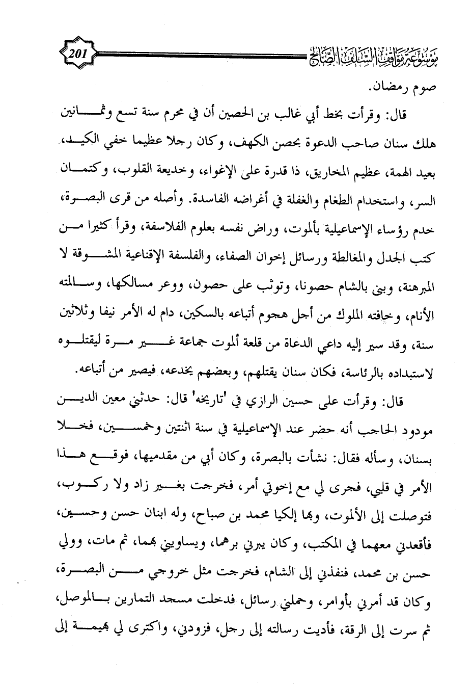 قال: وقرأت على حسين الرازي في 'تاريخه' قال: حدثني معين الدين مودود الحاجب أنه حضر عند الإسماعيلية في سنة اثنتين وخمسين، فخلا بسنان، وسأله فقال: نشأت بالبصرة، وكان أبي من مقدميها، فوقع هذا الأمر في قلبي، فجرى لي مع إخوتي أمر، فخرجت بغير زاد ولا ركوب، فتوصلت إلى الألموت، وبها إلكيا محمد بن صباح، وله ابنان حسن وحسين، فأقعدني معهما في المكتب، وكان يبرني برهما، ويساويني بهما، ثم مات، وولي حسن بن محمد، فنفذني إلى الشام، فخرجت مثل خروجي من البصرة، وكان قد أمرني بأوامر، وحملني رسائل، فدخلت مسجد التمارين بالموصل، ثم سرت إلى الرقة، فأديت رسالته إلى رجل، فزودني، واكترى لي بهيمة إلى