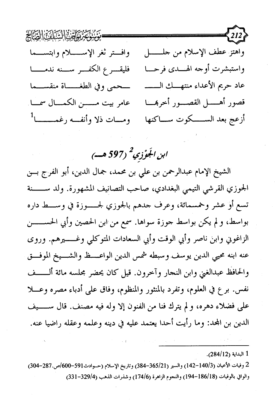 الشيخ الإمام عبد الرحمن بن علي بن محمد، جمال الدين، أبو الفرج بن الجوزي القرشي التيمي البغدادي، صاحب التصانيف المشهورة. ولد سنة تسع أو عشر وخمسمائة، وعرف جدهم بالجوزي لجوزة في وسط داره بواسط، ولم يكن بواسط جوزة سواها. سمع من ابن الحصين وأبي الحسن الزاغوني وابن ناصر وأبي الوقت وأبي السعادات المتوكلي وغيرهم. وروى عنه ابنه محيي الدين يوسف وسبطه شمس الدين الواعظ والشيخ الموفق والحافظ عبد الغني وابن النجار وآخرون. قيل كان يحضر مجلسه مائة ألف نفس. برع في العلوم، وتفرد بالمنثور والمنظوم، وفاق على أدباء مصره وعلا على فضلاء دهره، ولم يترك فنا من الفنون إلا وله فيه مصنف. قال سيف الدين بن المجد: وما رأيت أحدا يعتمد عليه في دينه وعلمه وعقله راضيا عنه.