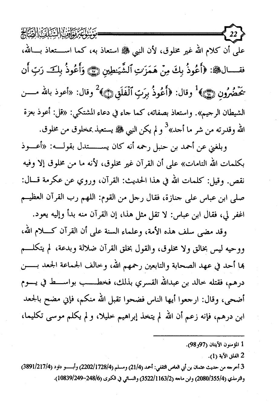 على أن كلام الله غير مخلوق، لأن النبي - صلى الله عليه وسلم - استعاذ به، كما استعاذ بالله، فقال - صلى الله عليه وسلم -: {أَعُوذُ بِكَ مِنْ هَمَزَاتِ الشَّيَاطِينِ (97) وَأَعُوذُ بِكَ رَبِّ أَنْ يَحْضُرُونِ (98)} (¬1) وقال: {أَعُوذُ بِرَبِّ الْفَلَقِ (1)} (¬2) وقال: «أعوذ بالله من الشيطان الرجيم». واستعاذ بصفاته، كما جاء في دعاء المشتكي: «قل: أعوذ بعزة الله وقدرته من شر ما أجد» (¬3) ولم يكن النبي - صلى الله عليه وسلم - يستعيذ بمخلوق من مخلوق.