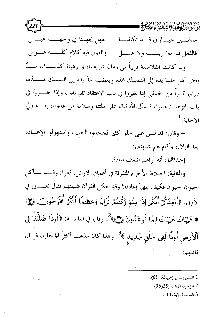 والثانية: اختلاط الأجزاء المتفرقة في أعماق الأرض. قالوا: وقد يأكل الحيوان الحيوان فكيف يتهيأ إعادته؟ وقد حكى القرآن شبهتهم فقال تعالى في الأولى: {أَيَعِدُكُمْ أَنَّكُمْ إِذَا مِتُّمْ وَكُنْتُمْ تُرَابًا وَعِظَامًا أَنَّكُمْ مُخْرَجُونَ (35) * هَيْهَاتَ هَيْهَاتَ لِمَا تُوعَدُونَ (36)} (¬2). وقال في الثانية: {أَئِذَا ضَلَلْنَا فِي الْأَرْضِ أَئِنَّا لَفِي خَلْقٍ جَدِيدٍ} (¬3). وهذا كان مذهب أكثر الجاهلية، قال قائلهم: