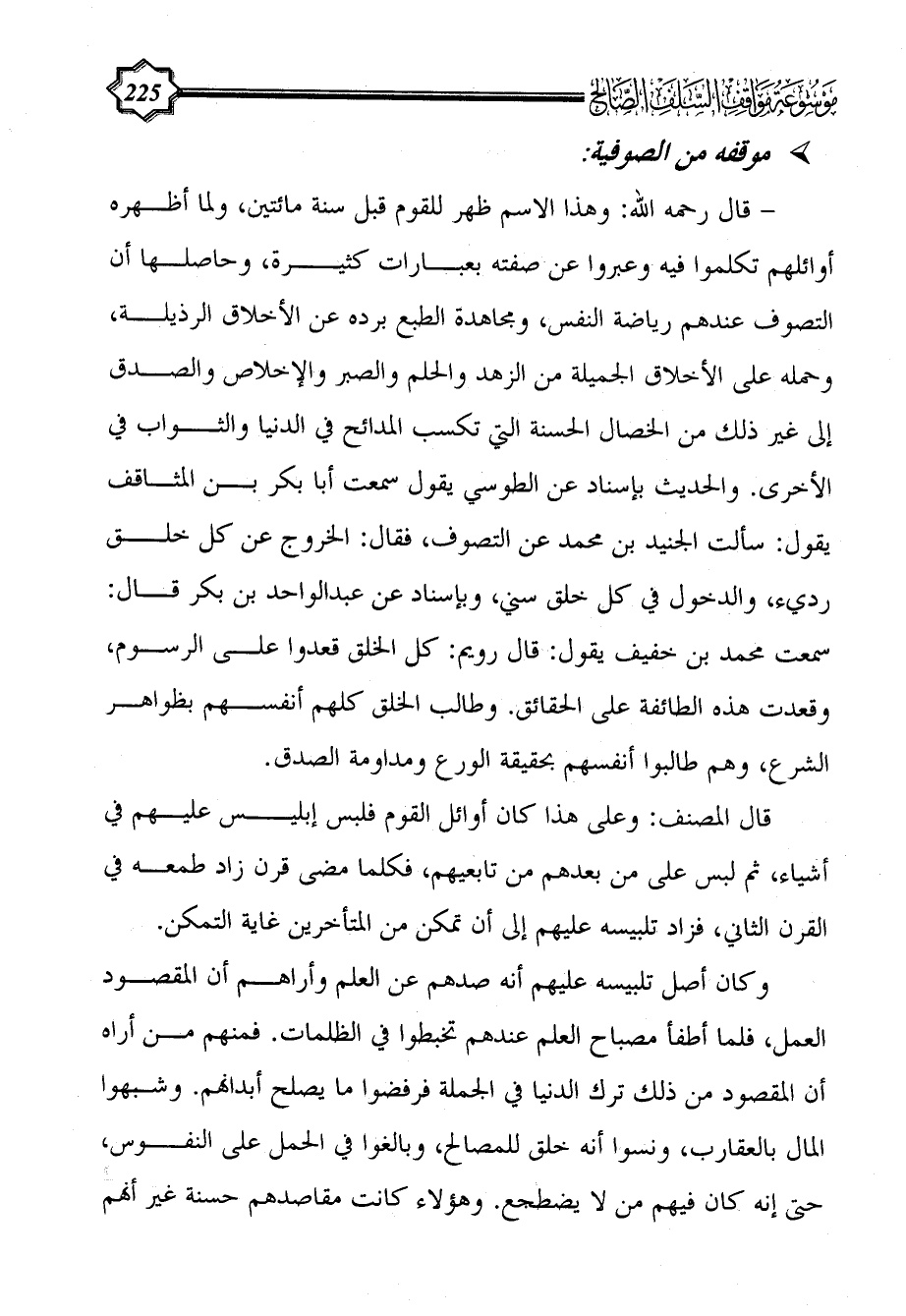 - قال رحمه الله: وهذا الاسم ظهر للقوم قبل سنة مائتين، ولما أظهره أوائلهم تكلموا فيه وعبروا عن صفته بعبارات كثيرة، وحاصلها أن التصوف عندهم رياضة النفس، ومجاهدة الطبع برده عن الأخلاق الرذيلة، وحمله على الأخلاق الجميلة من الزهد والحلم والصبر والإخلاص والصدق إلى غير ذلك من الخصال الحسنة التي تكسب المدائح في الدنيا والثواب في الأخرى. والحديث بإسناد عن الطوسي يقول سمعت أبا بكر بن المثاقف يقول: سألت الجنيد بن محمد عن التصوف، فقال: الخروج عن كل خلق رديء، والدخول في كل خلق سني، وبإسناد عن عبد الواحد بن بكر قال: سمعت محمد بن خفيف يقول: قال رويم: كل الخلق قعدوا على الرسوم، وقعدت هذه الطائفة على الحقائق. وطالب الخلق كلهم أنفسهم بظواهر الشرع، وهم طالبوا أنفسهم بحقيقة الورع ومداومة الصدق.