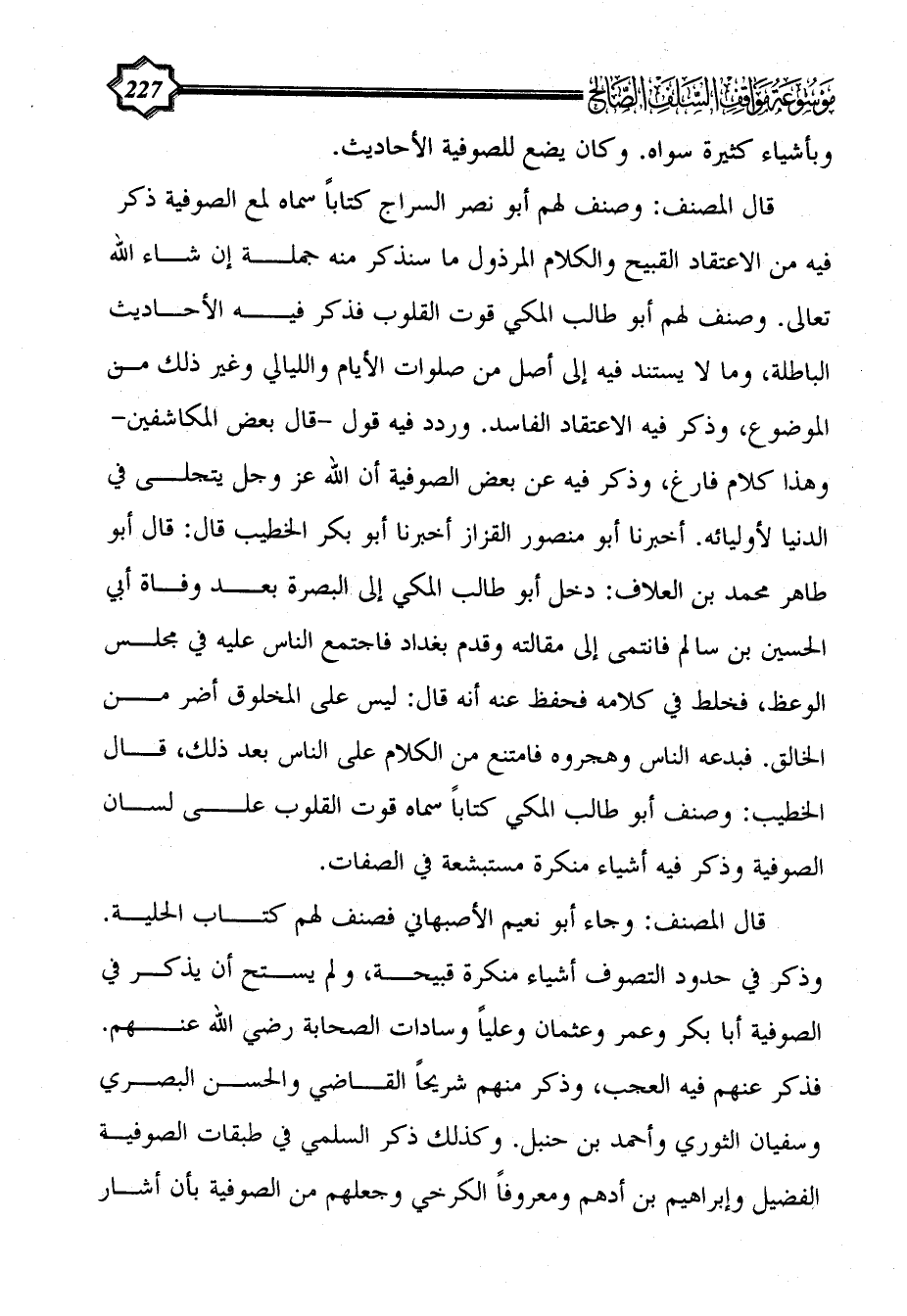 قال المصنف: وصنف لهم أبو نصر السراج كتاباً سماه لمع الصوفية ذكر فيه من الاعتقاد القبيح والكلام المرذول ما سنذكر منه جملة إن شاء الله تعالى. وصنف لهم أبو طالب المكي قوت القلوب فذكر فيه الأحاديث الباطلة، وما لا يستند فيه إلى أصل من صلوات الأيام والليالي وغير ذلك من الموضوع، وذكر فيه الاعتقاد الفاسد. وردد فيه قول -قال بعض المكاشفين- وهذا كلام فارغ، وذكر فيه عن بعض الصوفية أن الله عز وجل يتجلى في الدنيا لأوليائه. أخبرنا أبو منصور القزاز أخبرنا أبو بكر الخطيب قال: قال أبو طاهر محمد بن العلاف: دخل أبو طالب المكي إلى البصرة بعد وفاة أبي الحسين بن سالم فانتمى إلى مقالته وقدم بغداد فاجتمع الناس عليه في مجلس الوعظ، فخلط في كلامه فحفظ عنه أنه قال: ليس على المخلوق أضر من الخالق. فبدعه الناس وهجروه فامتنع من الكلام على الناس بعد ذلك، قال الخطيب: وصنف أبو طالب المكي كتاباً سماه قوت القلوب على لسان الصوفية وذكر فيه أشياء منكرة مستبشعة في الصفات.