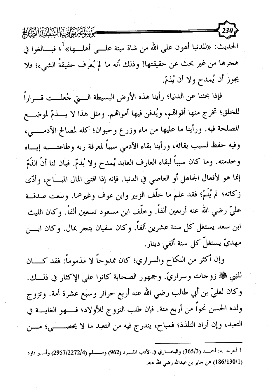 فإذا بحثنا عن الدنيا؛ رأينا هذه الأرض البسيطة التي جُعلت قراراً للخلق؛ تخرج منها أقواتهم، ويُدفن فيها أمواتهم. ومثل هذا لا يذمّ لموضع المصلحة فيه. ورأينا ما عليها من ماء وزرع وحيوان؛ كله لمصالح الآدمي، وفيه حفظ لسبب بقائه، ورأينا بقاء الآدمي سبباً لمعرفة ربه وطاعته إياه وخدمته. وما كان سبباً لبقاء العارف العابد يُمدح ولا يُذمّ. فبان لنا أنّ الذّمّ إنما هو لأفعال الجاهل أو العاصي في الدنيا. فإنه إذا اقتنى المال المباح، وأدّى زكاته؛ لم يُلَمْ؛ فقد علم ما خلّف الزبير وابن عوف وغيرهما. وبلغت صدقة عليّ رضي الله عنه أربعين ألفاً. وخلّف ابن مسعود تسعين ألفاً. وكان الليث ابن سعد يستغل كل سنة عشرين ألفاً. وكان سفيان يتجر بمال. وكان ابن مهديّ يستغلّ كل سنة ألفي دينار.