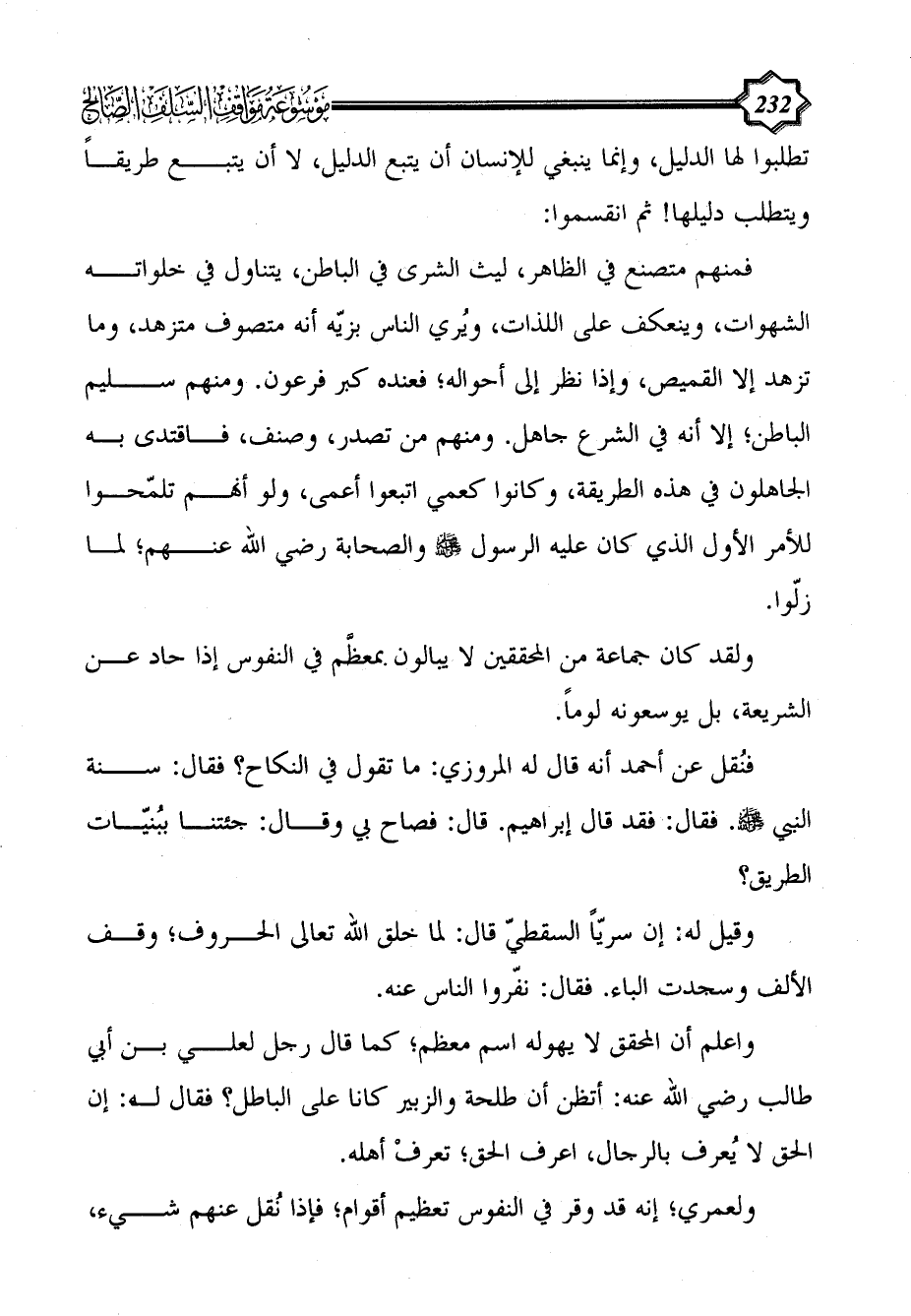 واعلم أن المحقق لا يهوله اسم معظم؛ كما قال رجل لعلي بن أبي طالب رضي الله عنه: أتظن أن طلحة والزبير كانا على الباطل؟ فقال له: إن الحق لا يُعرف بالرجال، اعرف الحق؛ تعرفْ أهله.