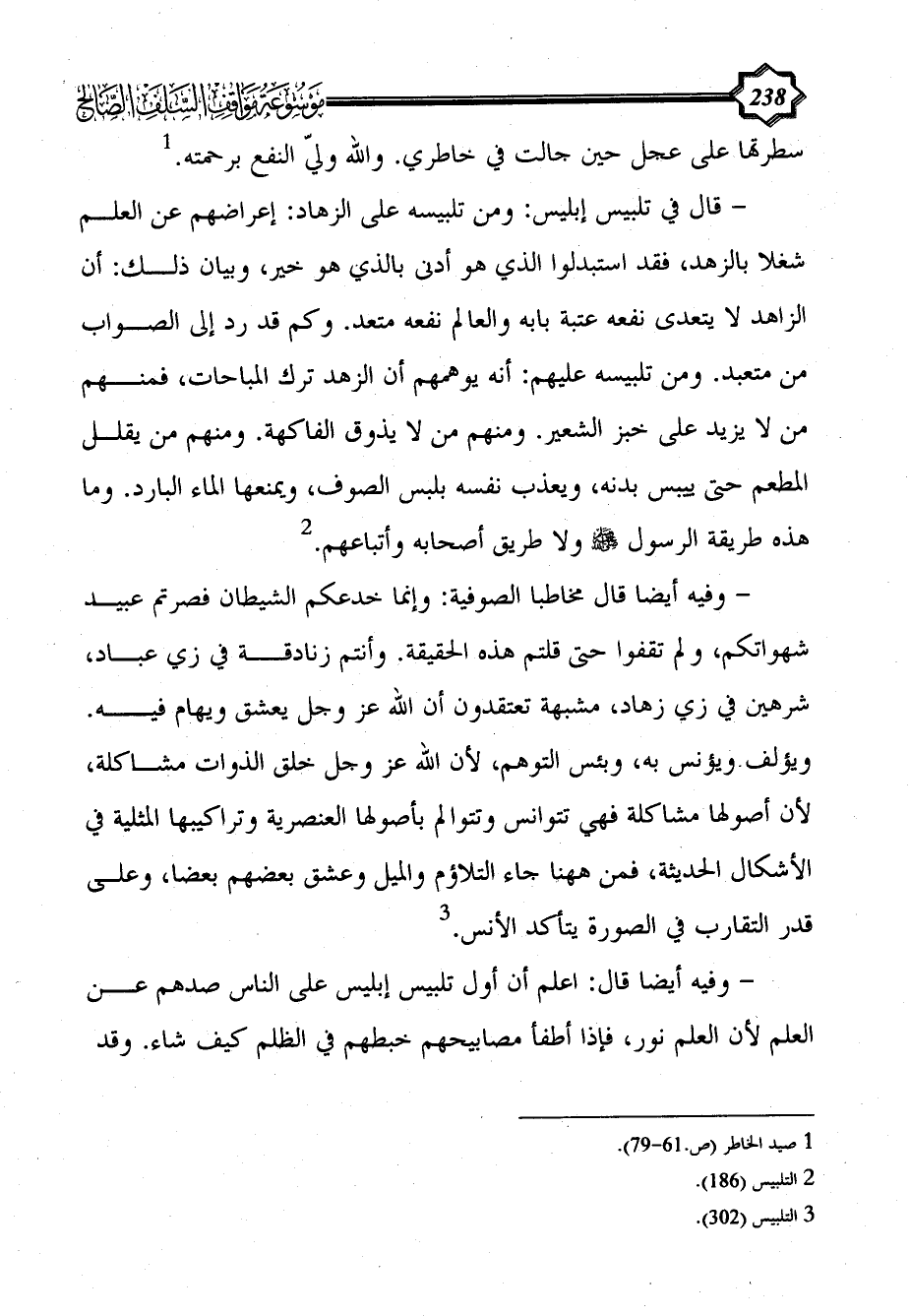 - وفيه أيضا قال: اعلم أن أول تلبيس إبليس على الناس صدهم عن العلم لأن العلم نور، فإذا أطفأ مصابيحهم خبطهم في الظلم كيف شاء. وقد
