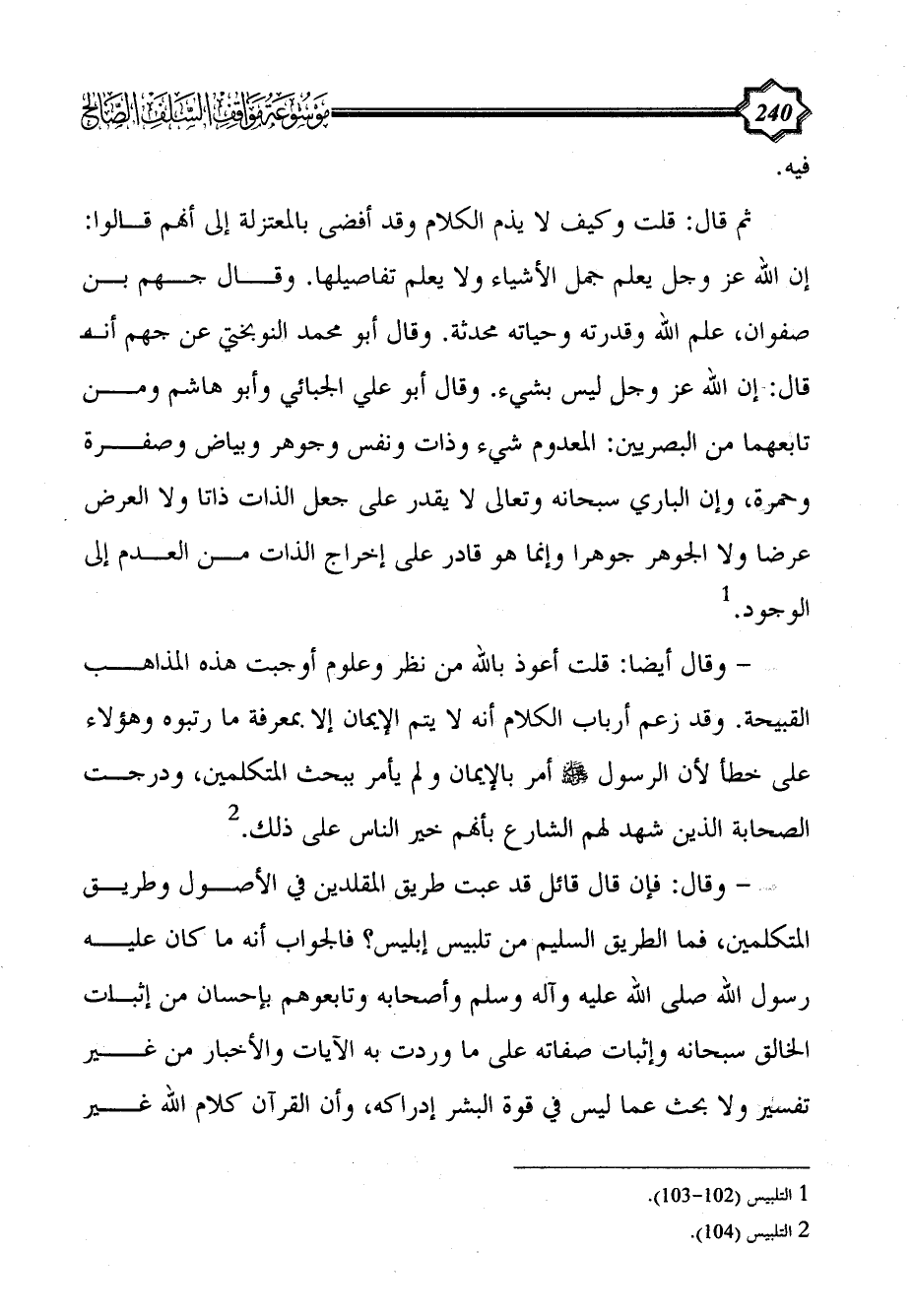 ثم قال: قلت وكيف لا يذم الكلام وقد أفضى بالمعتزلة إلى أنهم قالوا: إن الله عز وجل يعلم جمل الأشياء ولا يعلم تفاصيلها. وقال جهم بن صفوان، علم الله وقدرته وحياته محدثة. وقال أبو محمد النوبختي عن جهم أنه قال: إن الله عز وجل ليس بشيء. وقال أبو علي الجبائي وأبو هاشم ومن تابعهما من البصريين: المعدوم شيء وذات ونفس وجوهر وبياض وصفرة وحمرة، وإن الباري سبحانه وتعالى لا يقدر على جعل الذات ذاتا ولا العرض عرضا ولا الجوهر جوهرا وإنما هو قادر على إخراج الذات من العدم إلى الوجود. (¬1)