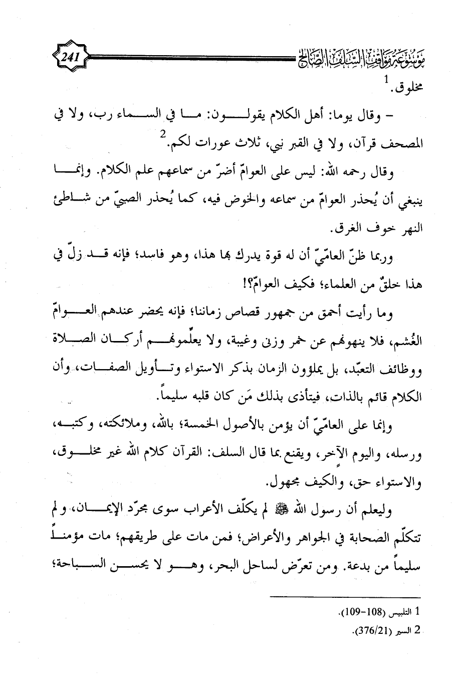 وإنما على العامّيّ أن يؤمن بالأصول الخمسة؛ بالله، وملائكته، وكتبه، ورسله، واليوم الآٍخر، ويقنع بما قال السلف: القرآن كلام الله غير مخلوق، والاستواء حق، والكيف مجهول.