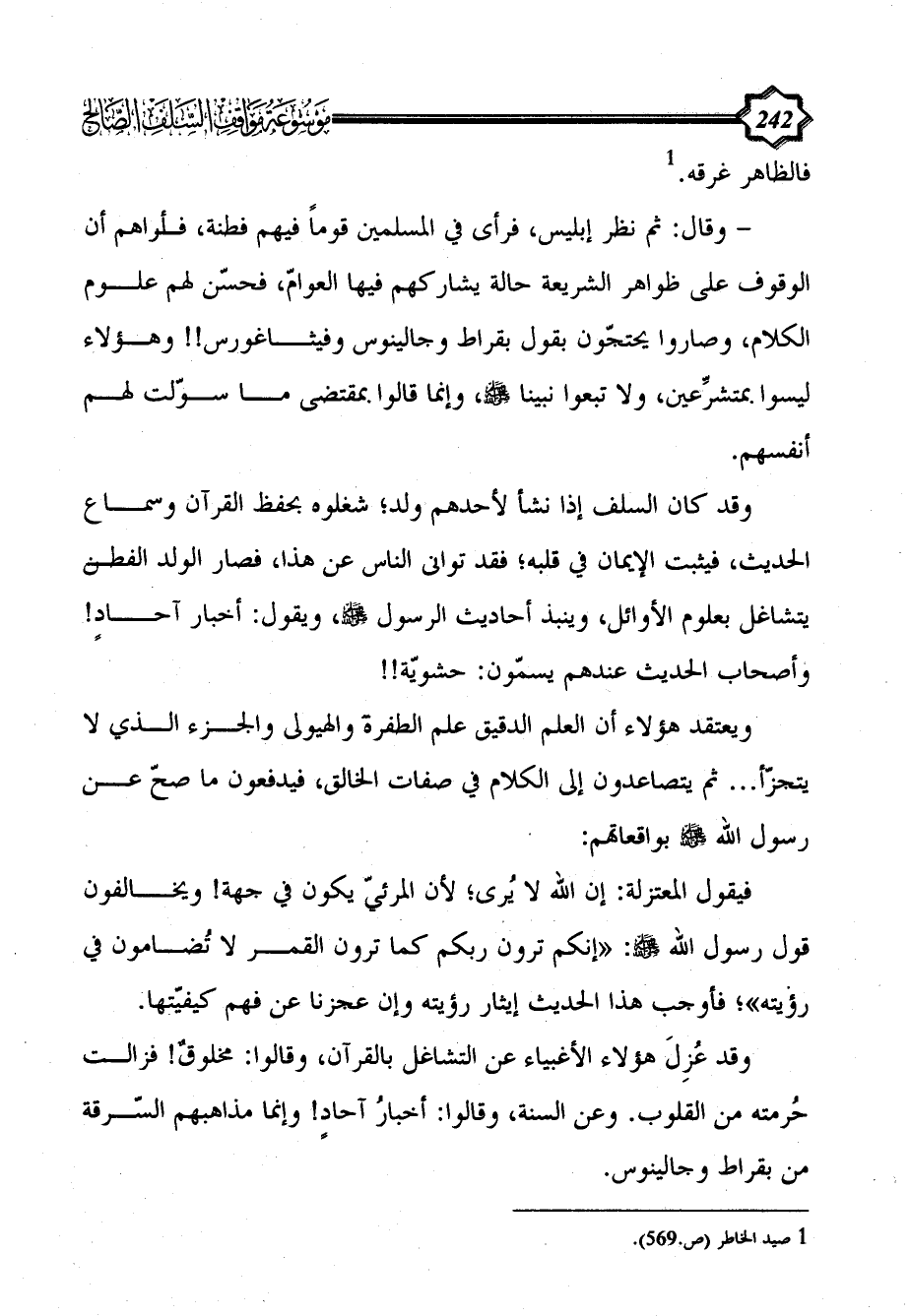 - وقال: ثم نظر إبليس، فرأى في المسلمين قوماً فيهم فطنة، فأراهم أن الوقوف على ظواهر الشريعة حالة يشاركهم فيها العوامّ، فحسّن لهم علوم الكلام، وصاروا يحتجّون بقول بقراط وجالينوس وفيثاغورس!! وهؤلاء ليسوا بمتشرِّعين، ولا تبعوا نبينا - صلى الله عليه وسلم -، وإنما قالوا بمقتضى ما سوّلت لهم أنفسهم.