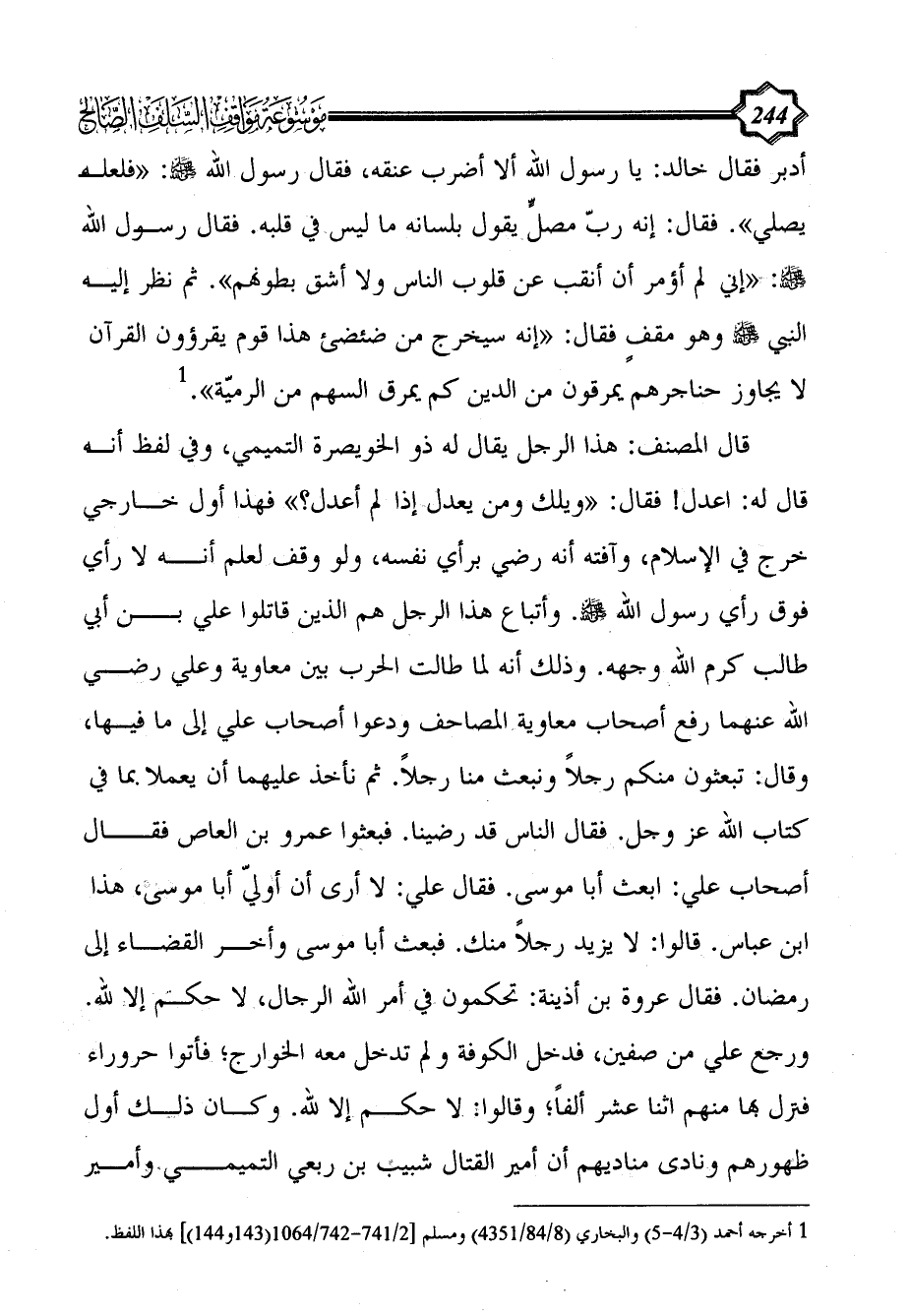 قال المصنف: هذا الرجل يقال له ذو الخويصرة التميمي، وفي لفظ أنه قال له: اعدل! فقال: «ويلك ومن يعدل إذا لم أعدل؟» فهذا أول خارجي خرج في الإسلام، وآفته أنه رضي برأي نفسه، ولو وقف لعلم أنه لا رأي فوق رأي رسول الله - صلى الله عليه وسلم -. وأتباع هذا الرجل هم الذين قاتلوا علي بن أبي طالب كرم الله وجهه. وذلك أنه لما طالت الحرب بين معاوية وعلي رضي الله عنهما رفع أصحاب معاوية المصاحف ودعوا أصحاب علي إلى ما فيها، وقال: تبعثون منكم رجلاً ونبعث منا رجلاً. ثم نأخذ عليهما أن يعملا بما في كتاب الله عز وجل. فقال الناس قد رضينا. فبعثوا عمرو بن العاص فقال أصحاب علي: ابعث أبا موسى. فقال علي: لا أرى أن أوليّ أبا موسى، هذا ابن عباس. قالوا: لا يزيد رجلاً منك. فبعث أبا موسى وأخر القضاء إلى رمضان. فقال عروة بن أذينة: تحكمون في أمر الله الرجال، لا حكم إلا لله. ورجع علي من صفين، فدخل الكوفة ولم تدخل معه الخوارج؛ فأتوا حروراء فنزل بها منهم اثنا عشر ألفاً؛ وقالوا: لا حكم إلا لله. وكان ذلك أول ظهورهم ونادى مناديهم أن أمير القتال شبيب بن ربعي التميمي وأمير