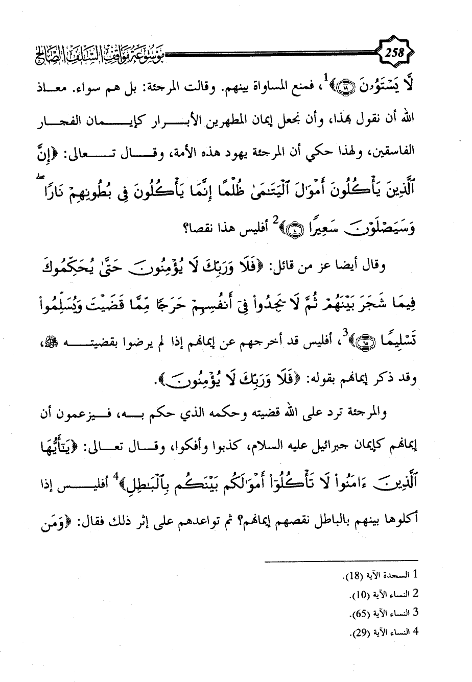 والمرجئة ترد على الله قضيته وحكمه الذي حكم به، فيزعمون أن إيمانهم كإيمان جبرائيل عليه السلام، كذبوا وأفكوا، وقال تعالى: {يَا أَيُّهَا الَّذِينَ آَمَنُوا لَا تَأْكُلُوا أَمْوَالَكُمْ بَيْنَكُمْ بِالْبَاطِلِ} (¬4) أفليس إذا أكلوها بينهم بالباطل نقصهم إيمانهم؟ ثم تواعدهم على إثر ذلك فقال: {وَمَنْ