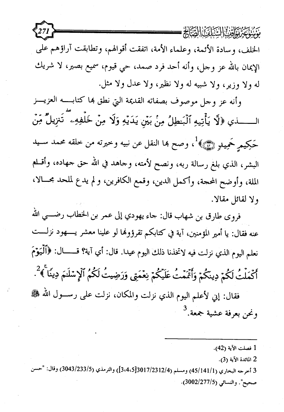 فروى طارق بن شهاب قال: جاء يهودي إلى عمر بن الخطاب رضي الله عنه فقال: يا أمير المؤمنين، آية في كتابكم تقرؤونها لو علينا معشر يهود نزلت نعلم اليوم الذي نزلت فيه لاتخذنا ذلك اليوم عيدا. قال: أي آية؟ قال: {الْيَوْمَ أَكْمَلْتُ لَكُمْ دِينَكُمْ وَأَتْمَمْتُ عَلَيْكُمْ نِعْمَتِي وَرَضِيتُ لَكُمُ الْإِسْلَامَ دِينًا} (¬2).