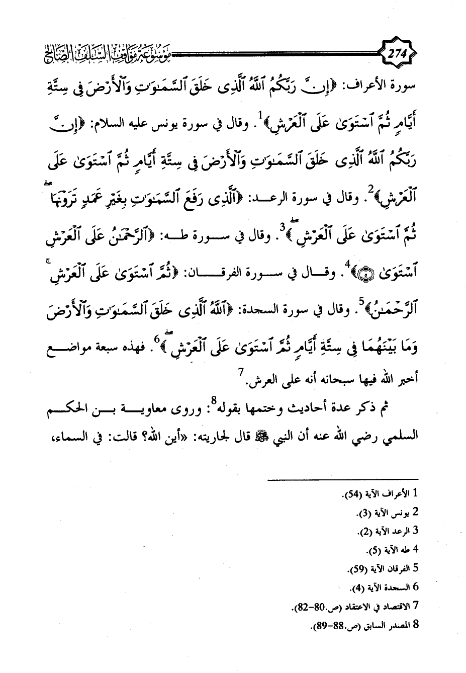 سورة الأعراف: {إِن رَبَّكُمُ اللَّهُ الَّذِي خَلَقَ السَّمَاوَاتِ وَالْأَرْضَ فِي سِتَّةِ أَيَّامٍ ثُمَّ اسْتَوَى عَلَى الْعَرْشِ} (¬1). وقال في سورة يونس عليه السلام: {إِن رَبَّكُمُ اللَّهُ الَّذِي خَلَقَ السَّمَاوَاتِ وَالْأَرْضَ فِي سِتَّةِ أَيَّامٍ ثُمَّ اسْتَوَى عَلَى الْعَرْشِ} (¬2). وقال في سورة الرعد: {الَّذِي رَفَعَ السَّمَاوَاتِ بِغَيْرِ عَمَدٍ تَرَوْنَهَا ثُمَّ اسْتَوَى عَلَى الْعَرْشِ} (¬3). وقال في سورة طه: {الرَّحْمَنُ عَلَى الْعَرْشِ اسْتَوَى (5)} (¬4). وقال في سورة الفرقان: {ثُمَّ اسْتَوَى عَلَى الْعَرْشِ الرَّحْمَنُ} (¬5). وقال في سورة السجدة: {اللَّهُ الَّذِي خَلَقَ السَّمَاوَاتِ وَالْأَرْضَ وَمَا بَيْنَهُمَا فِي سِتَّةِ أَيَّامٍ ثُمَّ اسْتَوَى عَلَى الْعَرْشِ} (¬6). فهذه سبعة مواضع أخبر الله فيها سبحانه أنه على العرش. (¬7)