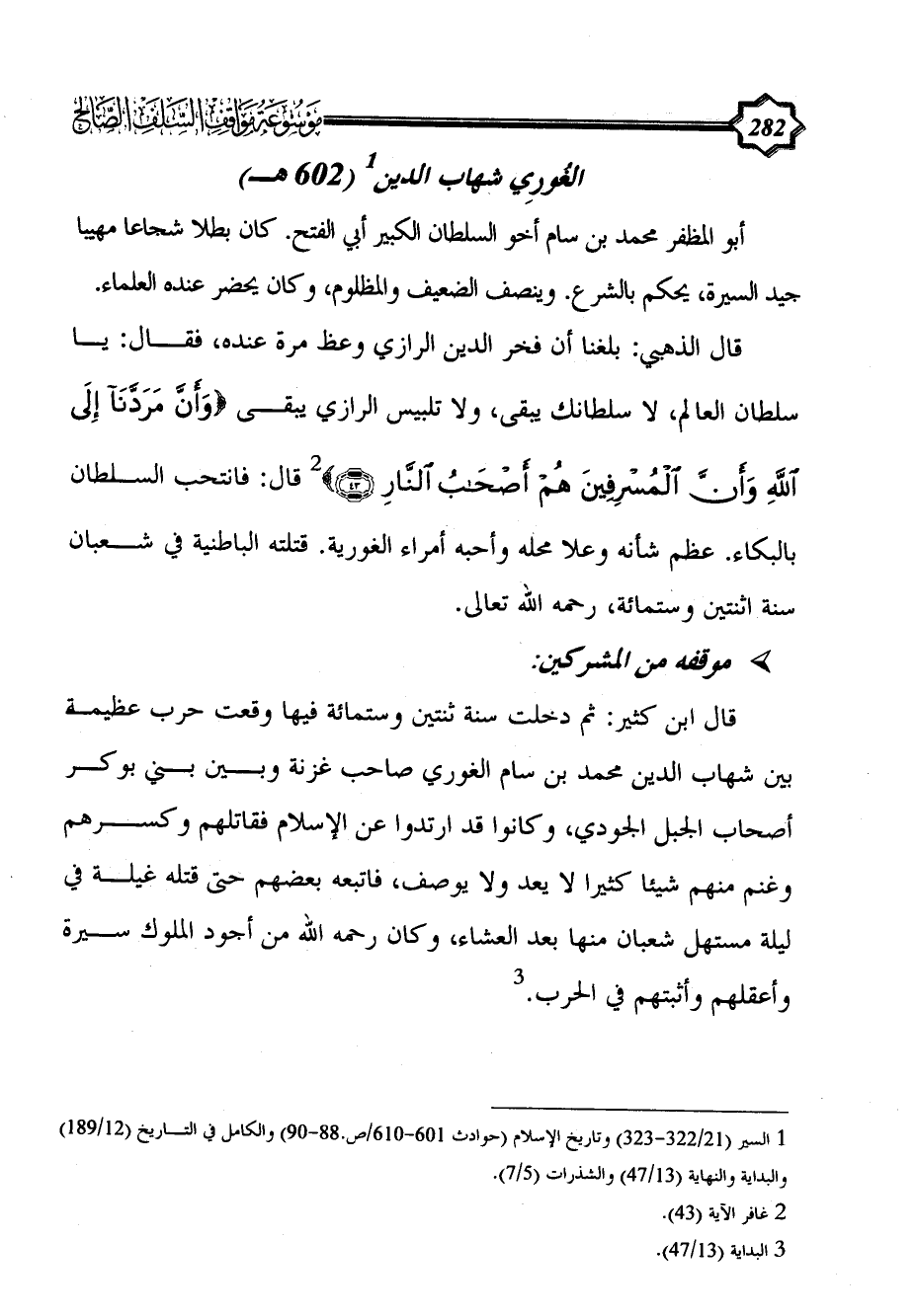 قال الذهبي: بلغنا أن فخر الدين الرازي وعظ مرة عنده، فقال: يا سلطان العالم، لا سلطانك يبقى، ولا تلبيس الرازي يبقى {وَأَنَّ مَرَدَّنَا إِلَى اللَّهِ وَأَن الْمُسْرِفِينَ هُمْ أَصْحَابُ النَّارِ (43)} (¬2) قال: فانتحب السلطان بالبكاء. عظم شأنه وعلا محله وأحبه أمراء الغورية. قتلته الباطنية في شعبان سنة اثنتين وستمائة، رحمه الله تعالى.