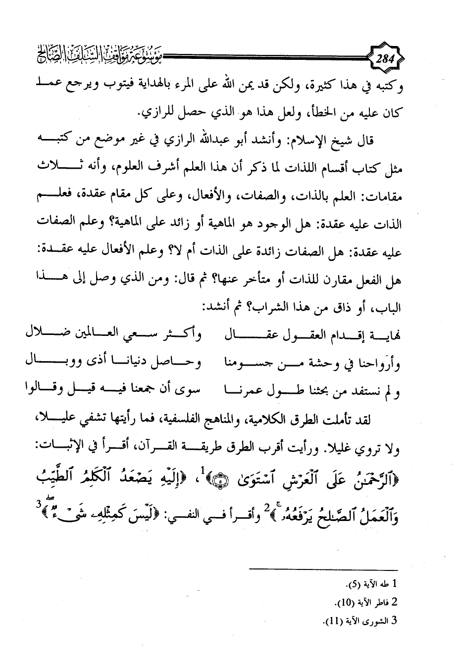 لقد تأملت الطرق الكلامية، والمناهج الفلسفية، فما رأيتها تشفي عليلا، ولا تروي غليلا. ورأيت أقرب الطرق طريقة القرآن، أقرأ في الإثبات: {الرَّحْمَنُ عَلَى الْعَرْشِ اسْتَوَى (5)} (¬1)، {إِلَيْهِ يَصْعَدُ الْكَلِمُ الطَّيِّبُ وَالْعَمَلُ الصَّالِحُ يَرْفَعُهُ} (¬2) وأقرأ في النفي: {لَيْسَ كَمِثْلِهِ شَيْءٌ} (¬3)