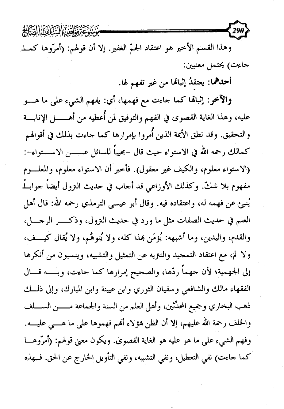 وهذا القسم الأخير هو اعتقاد الجمّ الغفير. إلا أن قولهم: (أمرّوها كما جاءت) يحتمل معنيين: