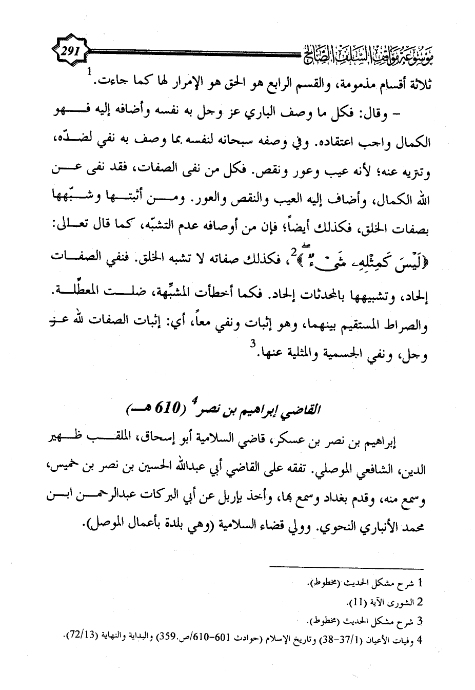 - وقال: فكل ما وصف الباري عز وجل به نفسه وأضافه إليه فهو الكمال واجب اعتقاده. وفي وصفه سبحانه لنفسه بما وصف به نفي لضدّه، وتنزيه عنه؛ لأنه عيب وعور ونقص. فكل من نفى الصفات، فقد نفى عن الله الكمال، وأضاف إليه العيب والنقص والعور. ومن أثبتها وشبّهها بصفات الخلق، فكذلك أيضاً؛ فإن من أوصافه عدم التشبّه، كما قال تعالى: {لَيْسَ كَمِثْلِهِ شَيْءٌ} (¬2)، فكذلك صفاته لا تشبه الخلق. فنفي الصفات إلحاد، وتشبيهها بالمحدثات إلحاد. فكما أخطأت المشبِّهة، ضلت المعطِّلة. والصراط المستقيم بينهما، وهو إثبات ونفي معاً، أي: إثبات الصفات لله عز وجل، ونفي الجسمية والمثلية عنها. (¬3)