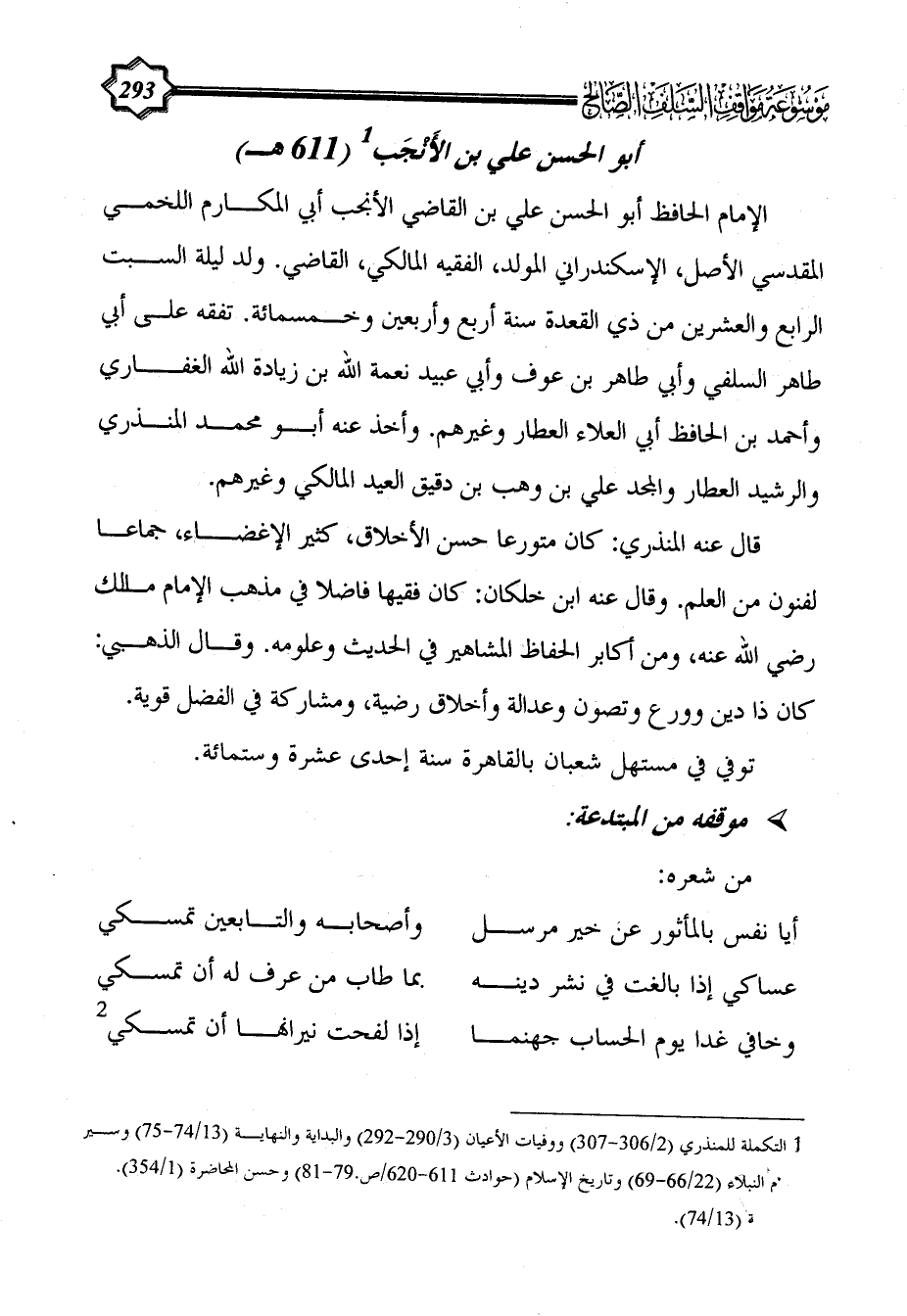 الإمام الحافظ أبو الحسن علي بن القاضي الأنجب أبي المكارم اللخمي المقدسي الأصل، الإسكندراني المولد، الفقيه المالكي، القاضي. ولد ليلة السبت الرابع والعشرين من ذي القعدة سنة أربع وأربعين وخمسمائة. تفقه على أبي طاهر السلفي وأبي طاهر بن عوف وأبي عبيد نعمة الله بن زيادة الله الغفاري وأحمد بن الحافظ أبي العلاء العطار وغيرهم. وأخذ عنه أبو محمد المنذري والرشيد العطار والمجد علي بن وهب بن دقيق العيد المالكي وغيرهم.