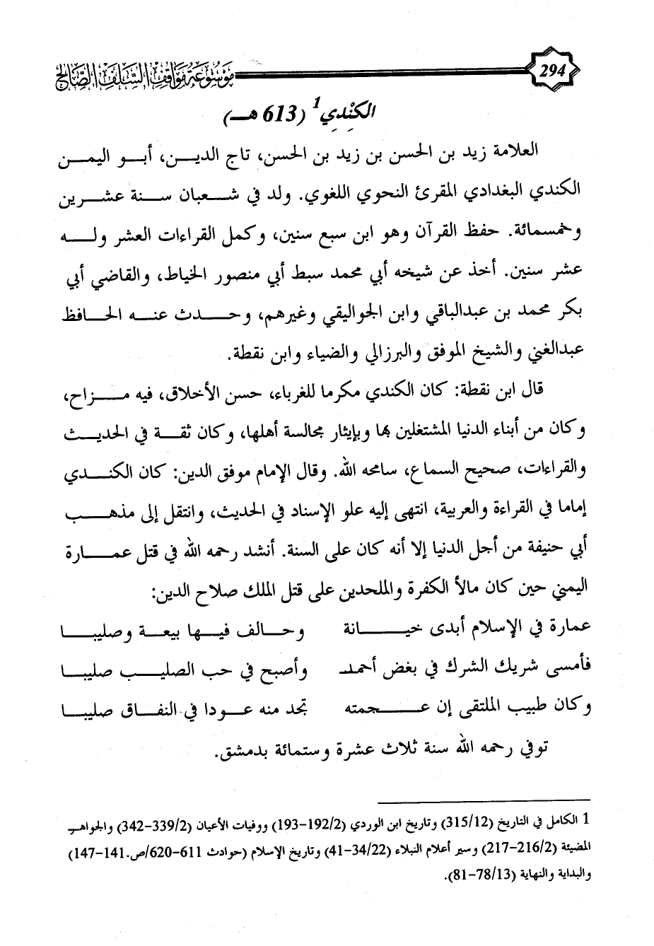العلامة زيد بن الحسن بن زيد بن الحسن، تاج الدين، أبو اليمن الكندي البغدادي المقرئ النحوي اللغوي. ولد في شعبان سنة عشرين وخمسمائة. حفظ القرآن وهو ابن سبع سنين، وكمل القراءات العشر وله عشر سنين. أخذ عن شيخه أبي محمد سبط أبي منصور الخياط، والقاضي أبي بكر محمد بن عبد الباقي وابن الجواليقي وغيرهم، وحدث عنه الحافظ عبد الغني والشيخ الموفق والبرزالي والضياء وابن نقطة.