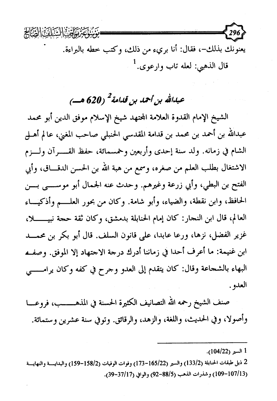 الشيخ الإمام القدوة العلامة المجتهد شيخ الإسلام موفق الدين أبو محمد عبد الله بن أحمد بن محمد بن قدامة المقدسي الحنبلي صاحب المغني، عالم أهل الشام في زمانه. ولد سنة إحدى وأربعين وخمسمائة، حفظ القرآن ولزم الاشتغال بطلب العلم من صغره، وسمع من هبة الله بن الحسن الدقاق، وأبي الفتح بن البطي، وأبي زرعة وغيرهم. وحدث عنه الجمال أبو موسى بن الحافظ، وابن نقطة، والضياء، وأبو شامة. وكان من بحور العلم وأذكياء العالم، قال ابن النجار: كان إمام الحنابلة بدمشق، وكان ثقة حجة نبيلا، غزير الفضل، نزها، ورعا عابدا، على قانون السلف. قال أبو بكر بن محمد ابن غنيمة: ما أعرف أحدا في زماننا أدرك درجة الاجتهاد إلا الموفق. وصفه البهاء بالشجاعة وقال: كان يتقدم إلى العدو وجرح في كفه وكان يرامي العدو.