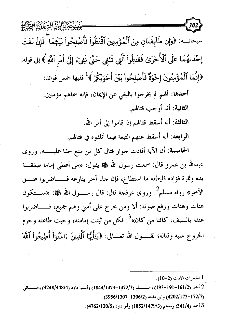 سبحانه: {وَإِنْ طائفتان مِنَ الْمُؤْمِنِينَ اقْتَتَلُوا فَأَصْلِحُوا بَيْنَهُمَا فَإِنْ بَغَتْ إِحْدَاهُمَا عَلَى الْأُخْرَى فَقَاتِلُوا الَّتِي تَبْغِي حَتَّى تَفِيءَ إِلَى أَمْرِ اللَّهِ} إلى قوله: {إِنَّمَا الْمُؤْمِنُونَ إِخْوَةٌ فَأَصْلِحُوا بَيْنَ أَخَوَيْكُمْ} (¬1) ففيها خمس فوائد: