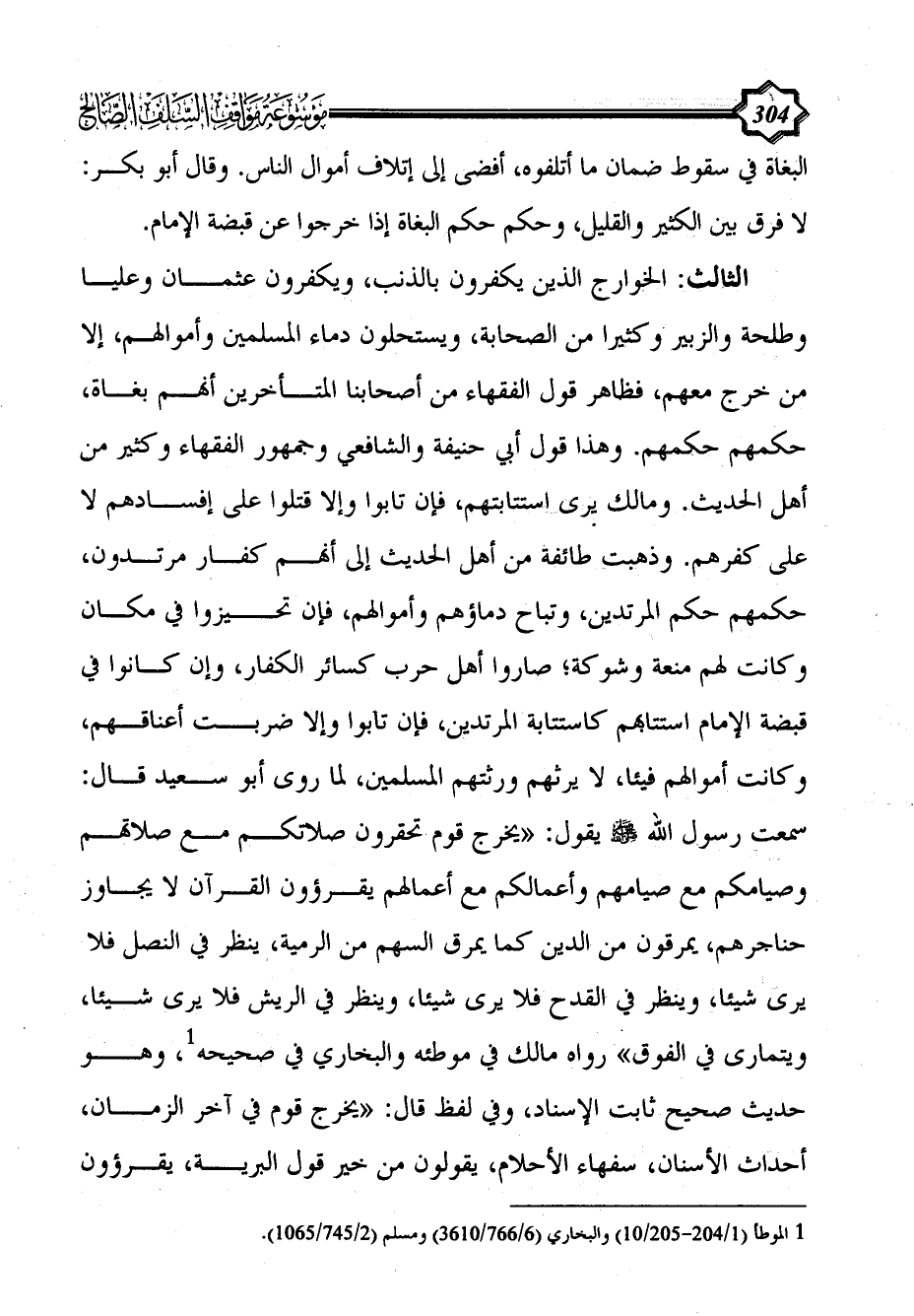 الثالث: الخوارج الذين يكفرون بالذنب، ويكفرون عثمان وعليا وطلحة والزبير وكثيرا من الصحابة، ويستحلون دماء المسلمين وأموالهم، إلا من خرج معهم، فظاهر قول الفقهاء من أصحابنا المتأخرين أنهم بغاة، حكمهم حكمهم. وهذا قول أبي حنيفة والشافعي وجمهور الفقهاء وكثير من أهل الحديث. ومالك يرى استتابتهم، فإن تابوا وإلا قتلوا على إفسادهم لا على كفرهم. وذهبت طائفة من أهل الحديث إلى أنهم كفار مرتدون، حكمهم حكم المرتدين، وتباح دماؤهم وأموالهم، فإن تحيزوا في مكان وكانت لهم منعة وشوكة؛ صاروا أهل حرب كسائر الكفار، وإن كانوا في قبضة الإمام استتابهم كاستتابة المرتدين، فإن تابوا وإلا ضربت أعناقهم، وكانت أموالهم فيئا، لا يرثهم ورثتهم المسلمين، لما روى أبو سعيد قال: سمعت رسول الله - صلى الله عليه وسلم - يقول: «يخرج قوم تحقرون صلاتكم مع صلاتهم وصيامكم مع صيامهم وأعمالكم مع أعمالهم يقرؤون القرآن لا يجاوز حناجرهم، يمرقون من الدين كما يمرق السهم من الرمية، ينظر في النصل فلا يرى شيئا، وينظر في القدح فلا يرى شيئا، وينظر في الريش فلا يرى شيئا، ويتمارى في الفوق» رواه مالك في موطئه والبخاري في صحيحه (¬1)، وهو حديث صحيح ثابت الإسناد، وفي لفظ قال: «يخرج قوم في آخر الزمان، أحداث الأسنان، سفهاء الأحلام، يقولون من خير قول البرية، يقرؤون