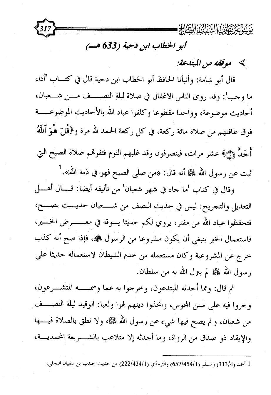 قال أبو شامة: وأنبأنا الحافظ أبو الخطاب ابن دحية قال في كتاب 'أداء ما وجب': وقد روى الناس الاغفال في صلاة ليلة النصف من شعبان، أحاديث موضوعة، وواحدا مقطوعا وكلفوا عباد الله بالأحاديث الموضوعة فوق طاقتهم من صلاة مائة ركعة، في كل ركعة الحمد لله مرة و {قُلْ هُوَ اللَّهُ أَحَدٌ (1)} عشر مرات، فينصرفون وقد غلبهم النوم فتفوتهم صلاة الصبح التي ثبت عن رسول الله - صلى الله عليه وسلم - أنه قال: «من صلى الصبح فهو في ذمة الله». (¬1)