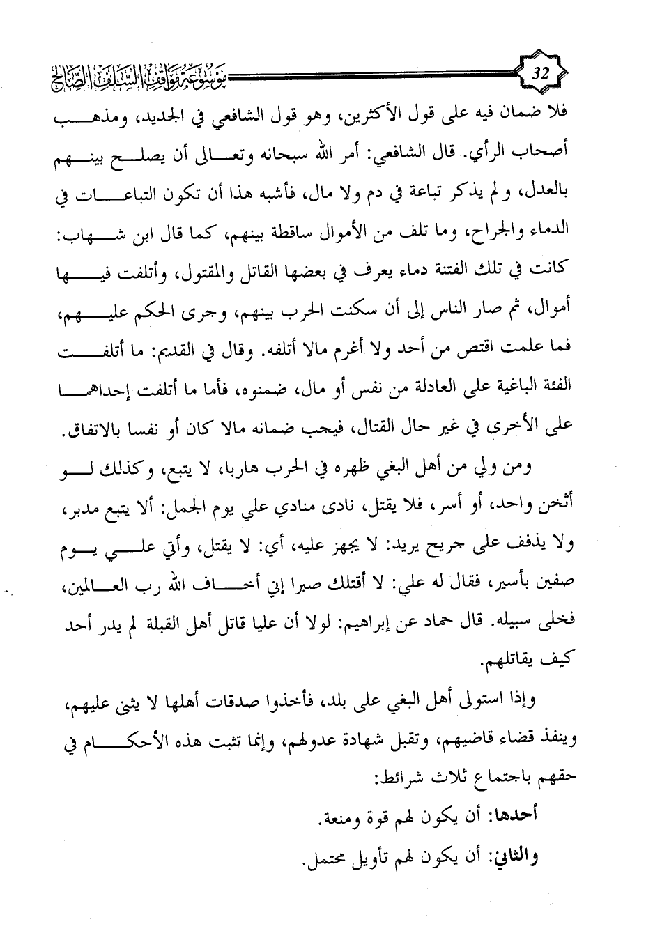 ومن ولي من أهل البغي ظهره في الحرب هاربا، لا يتبع، وكذلك لو أثخن واحد، أو أسر، فلا يقتل، نادى منادي علي يوم الجمل: ألا يتبع مدبر، ولا يذفف على جريح يريد: لا يجهز عليه، أي: لا يقتل، وأتي علي يوم صفين بأسير، فقال له علي: لا أقتلك صبرا إني أخاف الله رب العالمين، فخلى سبيله. قال حماد عن إبراهيم: لولا أن عليا قاتل أهل القبلة لم يدر أحد كيف يقاتلهم.