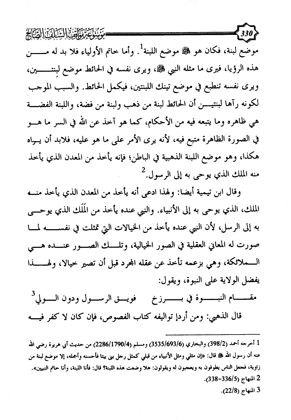 وقال ابن تيمية أيضا: ولهذا ادعى أنه يأخذ من المعدن الذي يأخذ منه الملك، الذي يوحى به إلى الأنبياء. والنبي عنده يأخذ من المَلَك الذي يوحى به إلى الرسل، لأن النبي عنده يأخذ من الخيالات التي تمثلت في نفسه لما صورت له المعاني العقلية في الصور الخيالية، وتلك الصور عنده هي الملائكة، وهي بزعمه تأخذ عن عقله المجرد قبل أن تصير خيالا، ولهذا يفضل الولاية على النبوة، ويقول:
