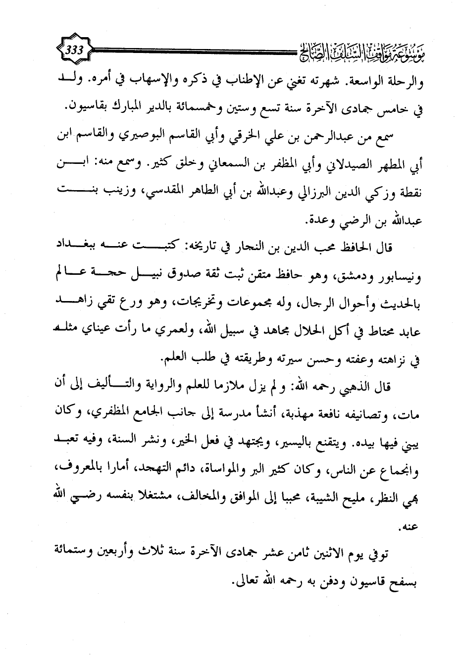 والرحلة الواسعة. شهرته تغني عن الإطناب في ذكره والإسهاب في أمره. ولد في خامس جمادى الآخرة سنة تسع وستين وخمسمائة بالدير المبارك بقاسيون.
