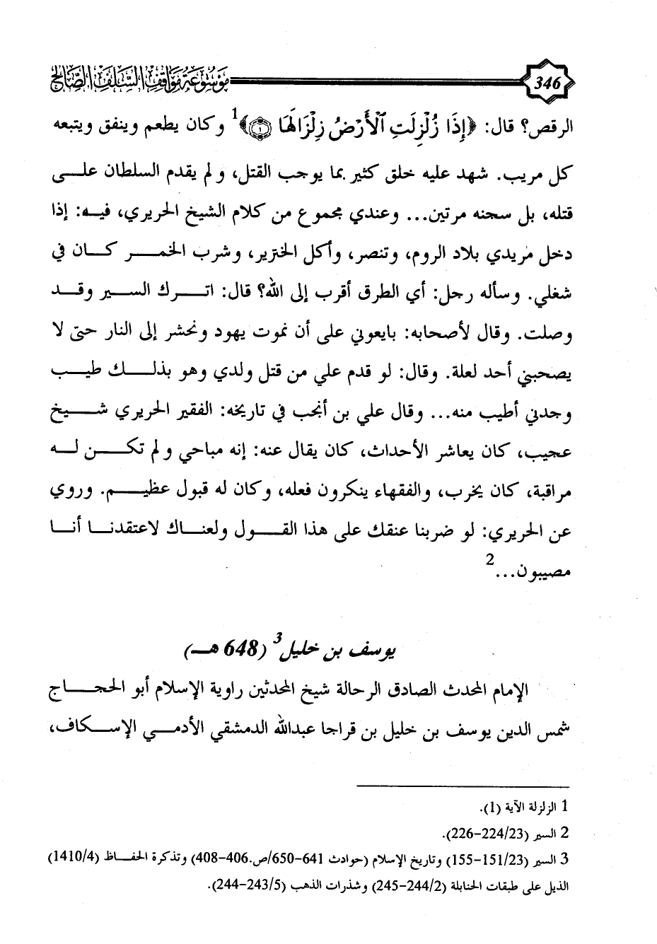 الرقص؟ قال: {إِذَا زُلْزِلَتِ الْأَرْضُ زِلْزَالَهَا (1)} (¬1) وكان يطعم وينفق ويتبعه كل مريب. شهد عليه خلق كثير بما يوجب القتل، ولم يقدم السلطان على قتله، بل سجنه مرتين ... وعندي مجموع من كلام الشيخ الحريري، فيه: إذا دخل مريدي بلاد الروم، وتنصر، وأكل الخنزير، وشرب الخمر كان في شغلي. وسأله رجل: أي الطرق أقرب إلى الله؟ قال: اترك السير وقد وصلت. وقال لأصحابه: بايعوني على أن نموت يهود ونحشر إلى النار حتى لا يصحبني أحد لعلة. وقال: لو قدم علي من قتل ولدي وهو بذلك طيب وجدني أطيب منه ... وقال علي بن أنجب في تاريخه: الفقير الحريري شيخ عجيب، كان يعاشر الأحداث، كان يقال عنه: إنه مباحي ولم تكن له مراقبة، كان يخرب، والفقهاء ينكرون فعله، وكان له قبول عظيم. وروي عن الحريري: لو ضربنا عنقك على هذا القول ولعناك لاعتقدنا أنا مصيبون ... (¬2)