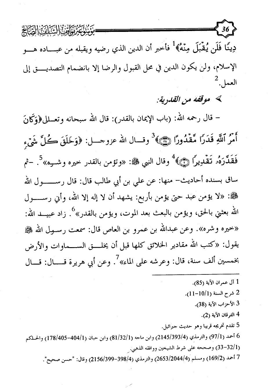 - قال رحمه الله: (باب الإيمان بالقدر): قال الله سبحانه وتعالى {وَكَانَ أَمْرُ اللَّهِ قَدَرًا مَقْدُورًا (38)} (¬3) وقال الله عزوجل: {وَخَلَقَ كُلَّ شَيْءٍ فَقَدَّرَهُ تَقْدِيرًا (2)} (¬4) وقال النبي - صلى الله عليه وسلم -: «وتؤمن بالقدر خيره وشره» (¬5). -ثم ساق بسنده أحاديث- منها: عن علي بن أبي طالب قال: قال رسول الله - صلى الله عليه وسلم -: «لا يؤمن عبد حتى يؤمن بأربع: يشهد أن لا إله إلا الله، وأني رسول الله بعثني بالحق، ويؤمن بالبعث بعد الموت، ويؤمن بالقدر» (¬6). زاد عبيد الله: «خيره وشره». وعن عبد الله بن عمرو بن العاص قال: سمعت رسول الله - صلى الله عليه وسلم - يقول: «كتب الله مقادير الخلائق كلها قبل أن يخلق السماوات والأرض بخمسين ألف سنة، قال: وعرشه على الماء» (¬7). وعن أبي هريرة قال: قال
