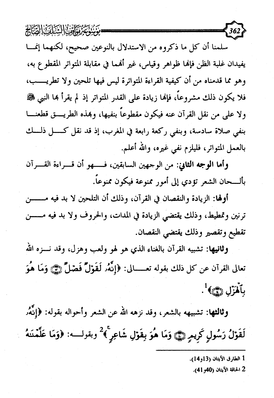 وثانيها: تشبيه القرآن بالغناء الذي هو لهو ولعب وهزل، وقد نزه الله تعالى القرآن عن كل ذلك بقوله تعالى: {إِنَّهُ لَقَوْلٌ فَصْلٌ (13) وَمَا هُوَ بِالْهَزْلِ (14)} (¬1).